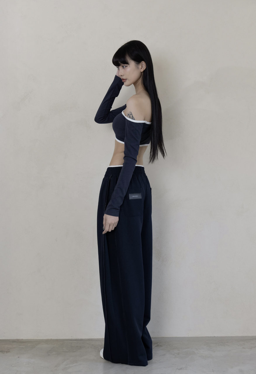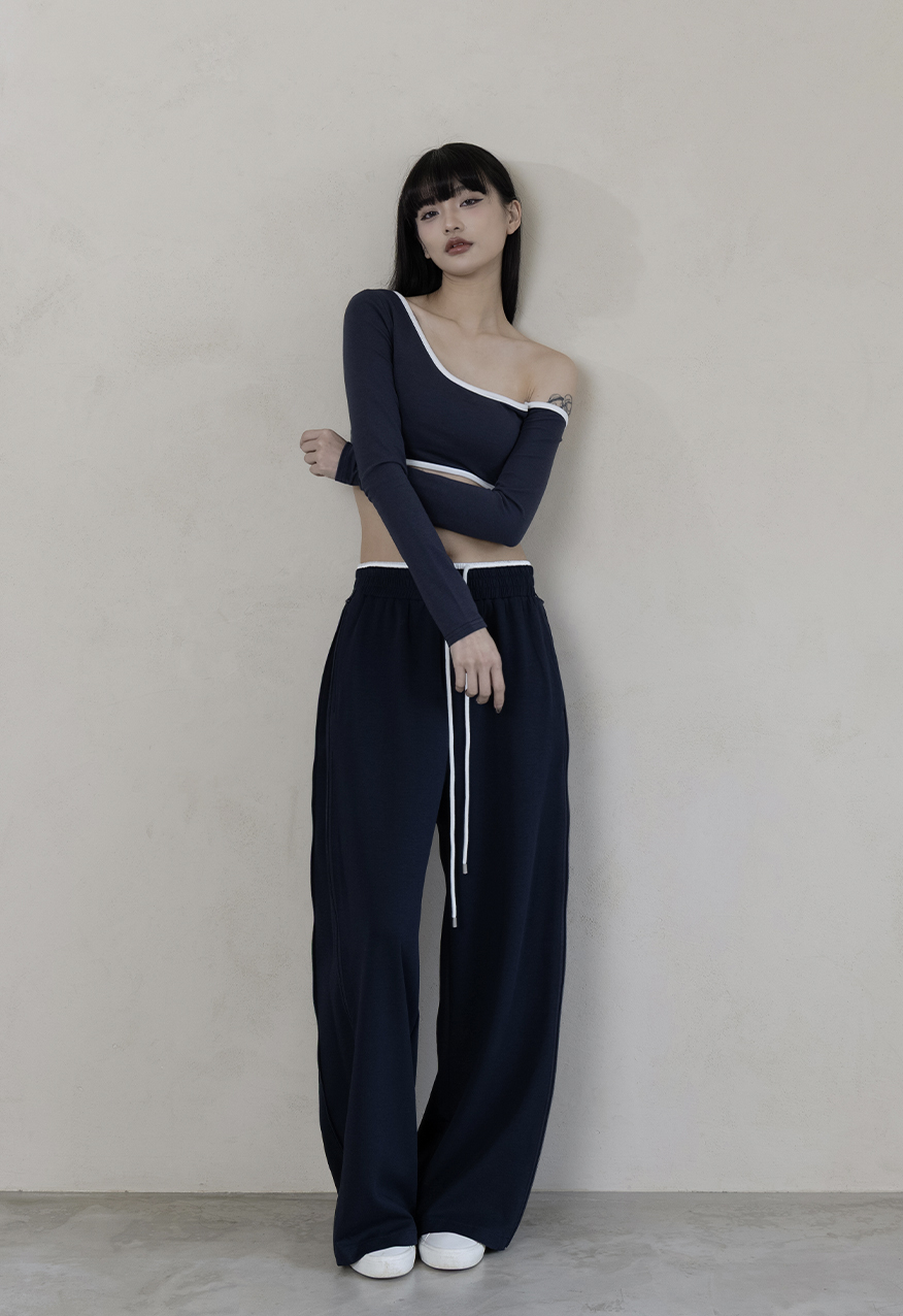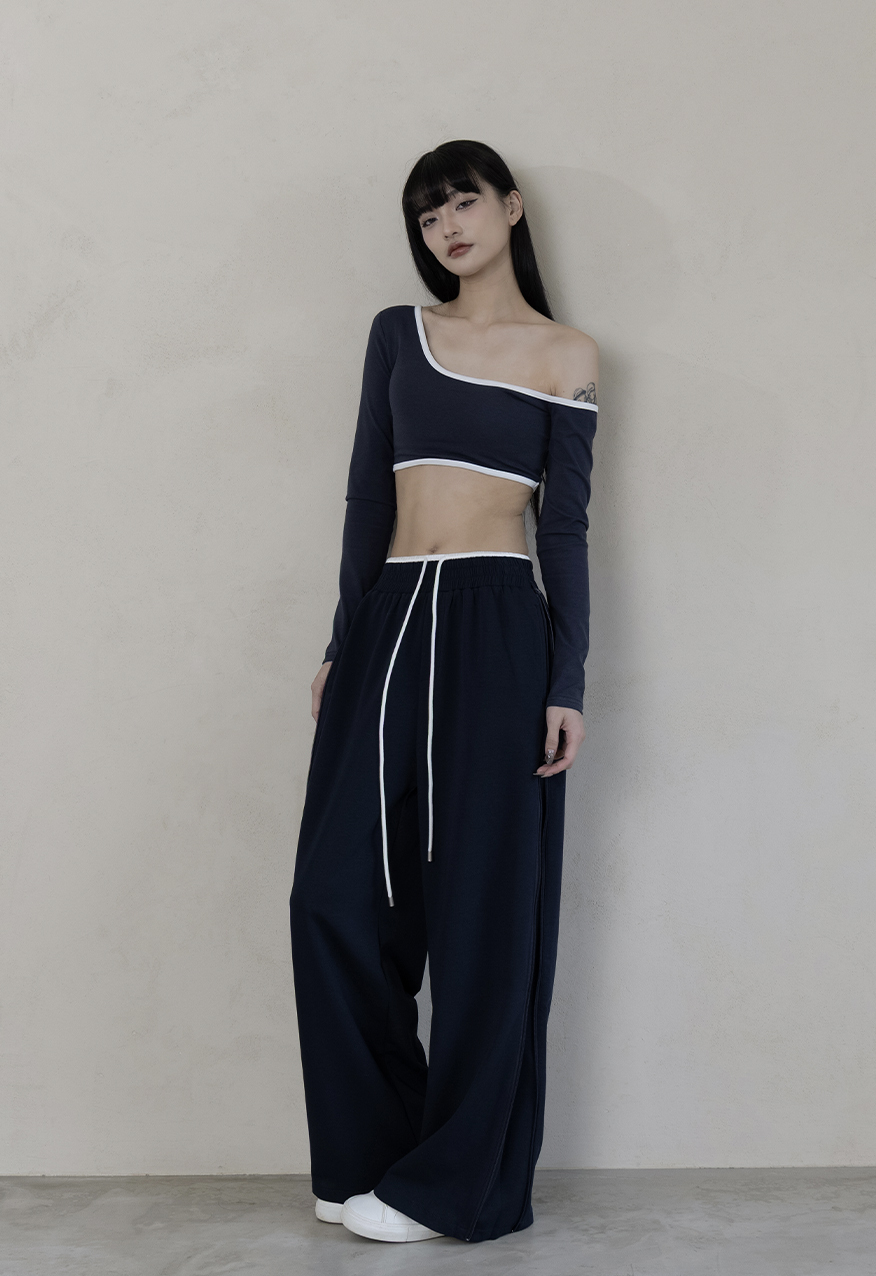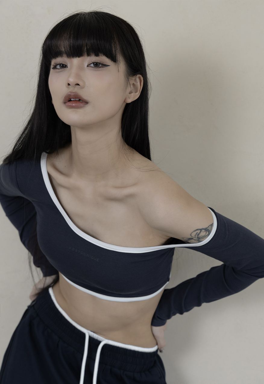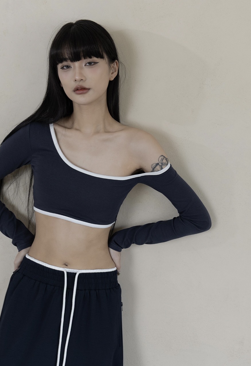 An asymmetrical cut that elegantly highlights the shoulder and neckline.