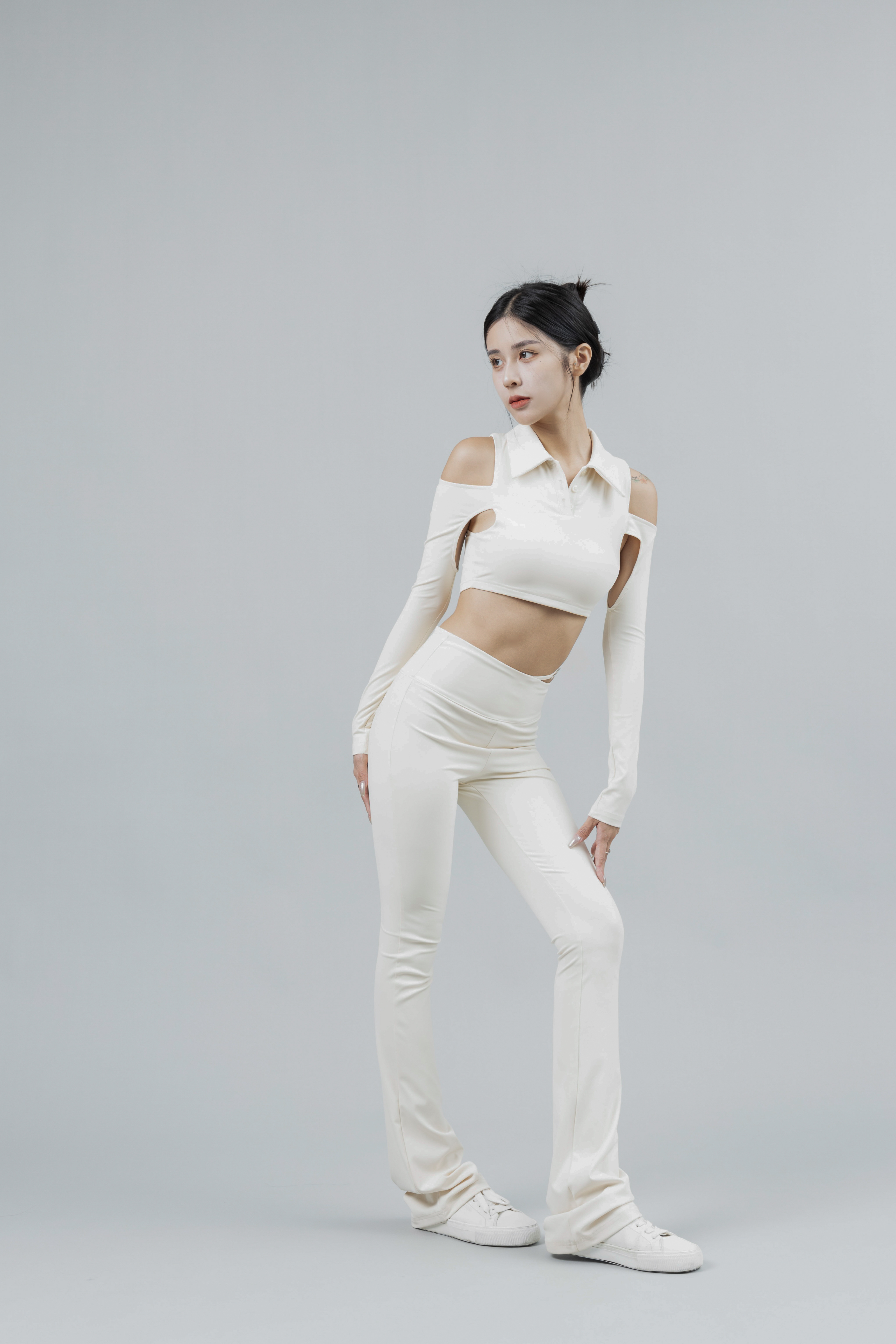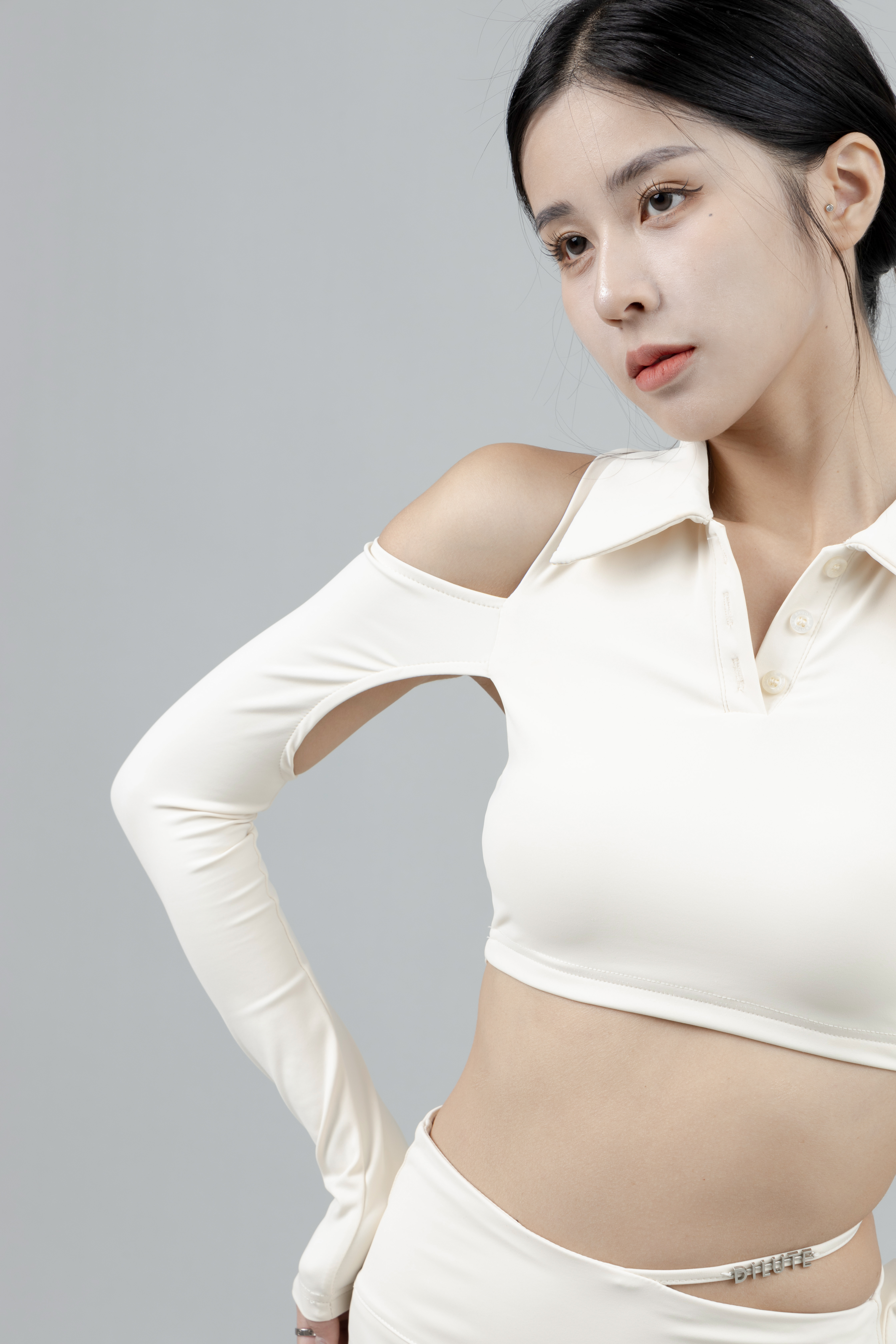 彈性材質,短版合身,肩部與腋下挖空,領口扣子