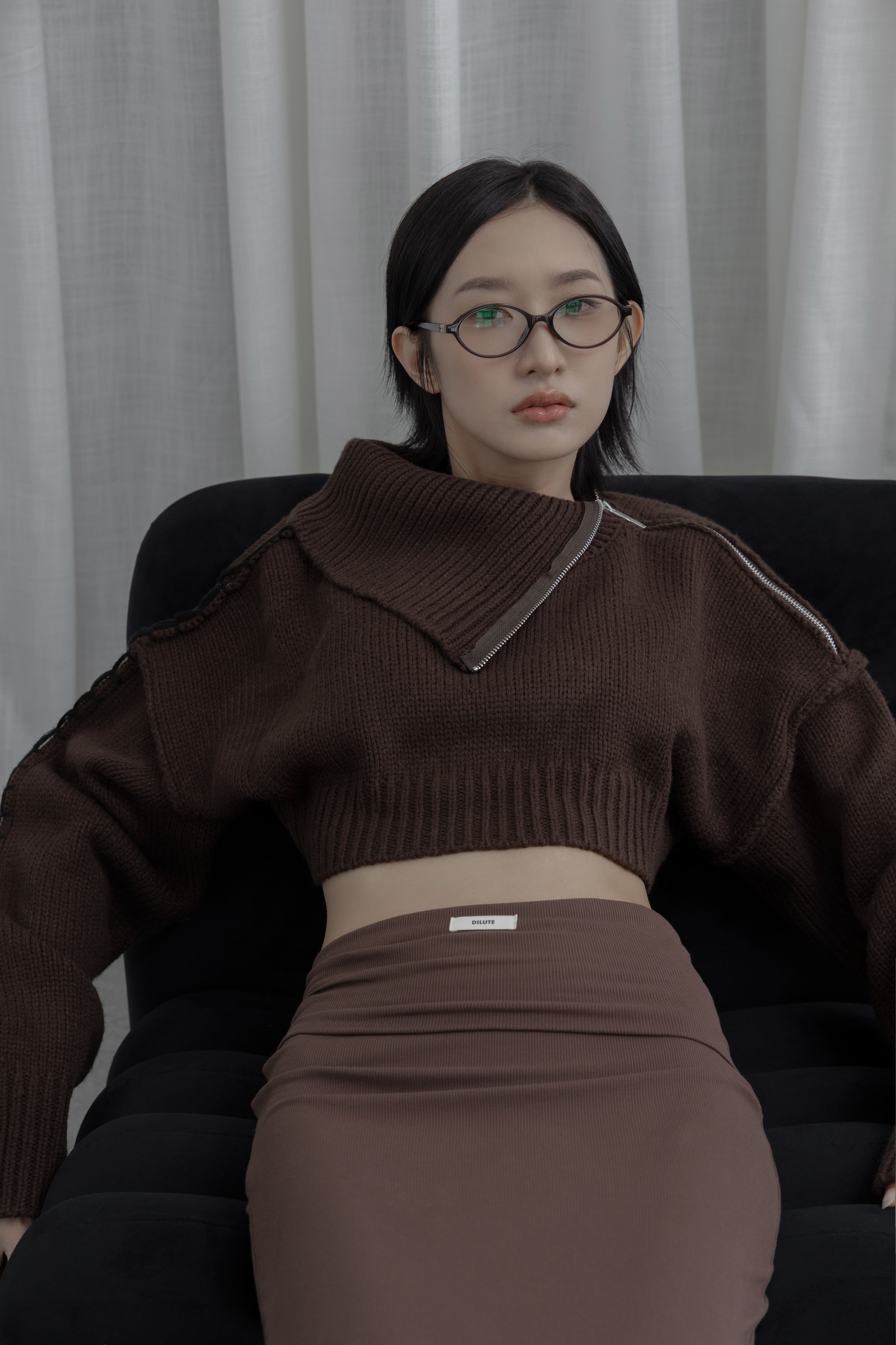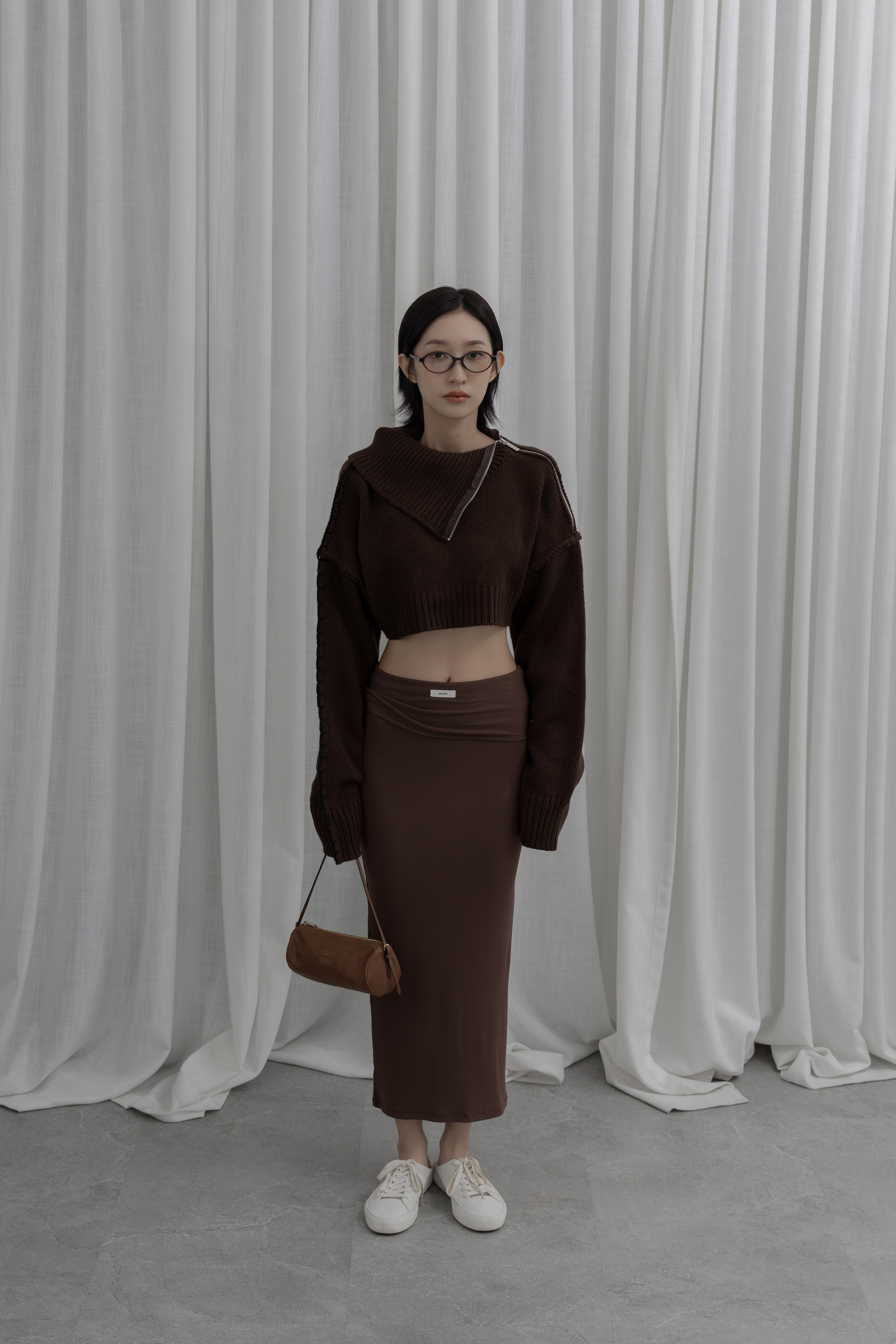 A warm cocoa hue in a high-stretch fabric, featuring a collar detail that creates an elegant, elongated silhouette.