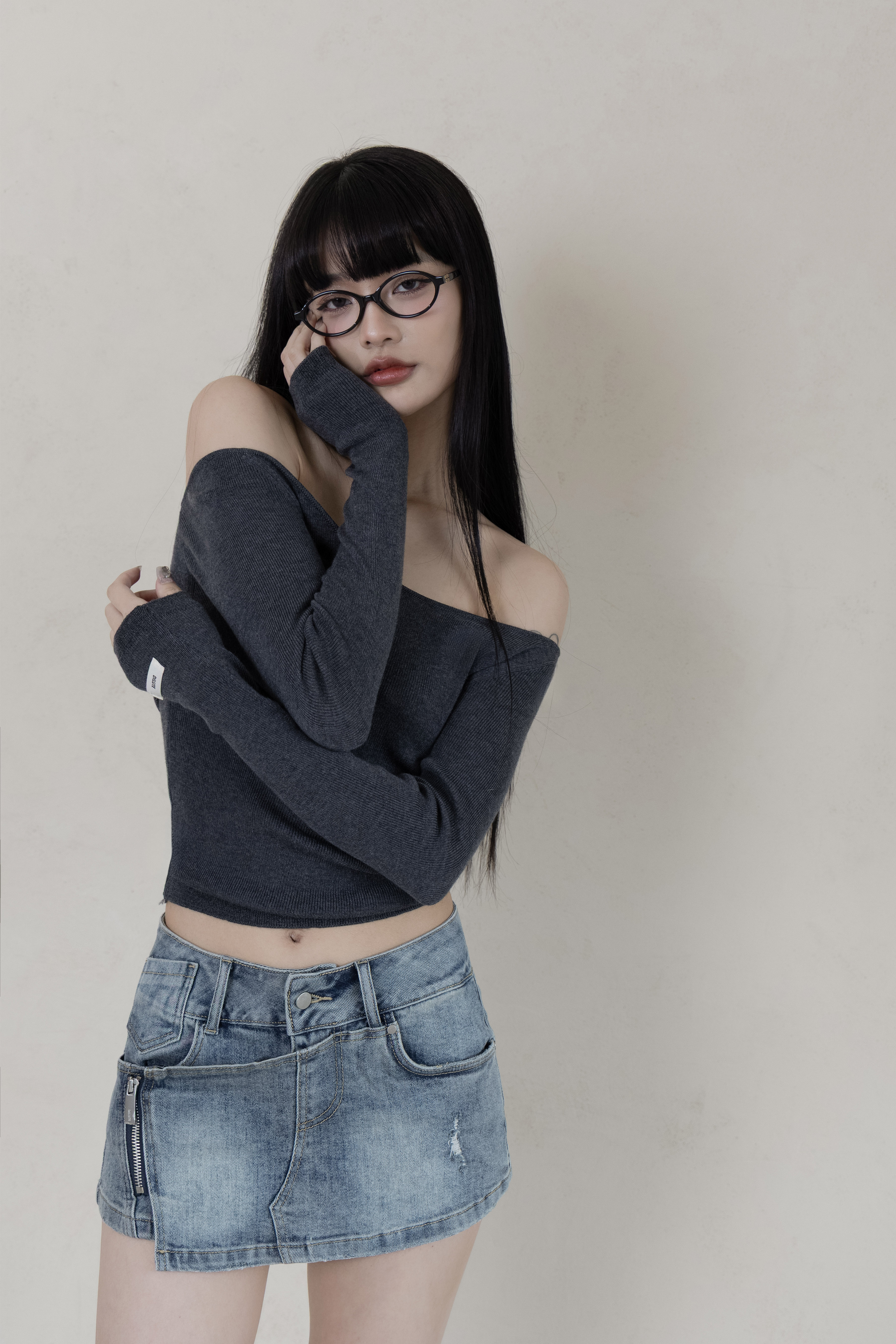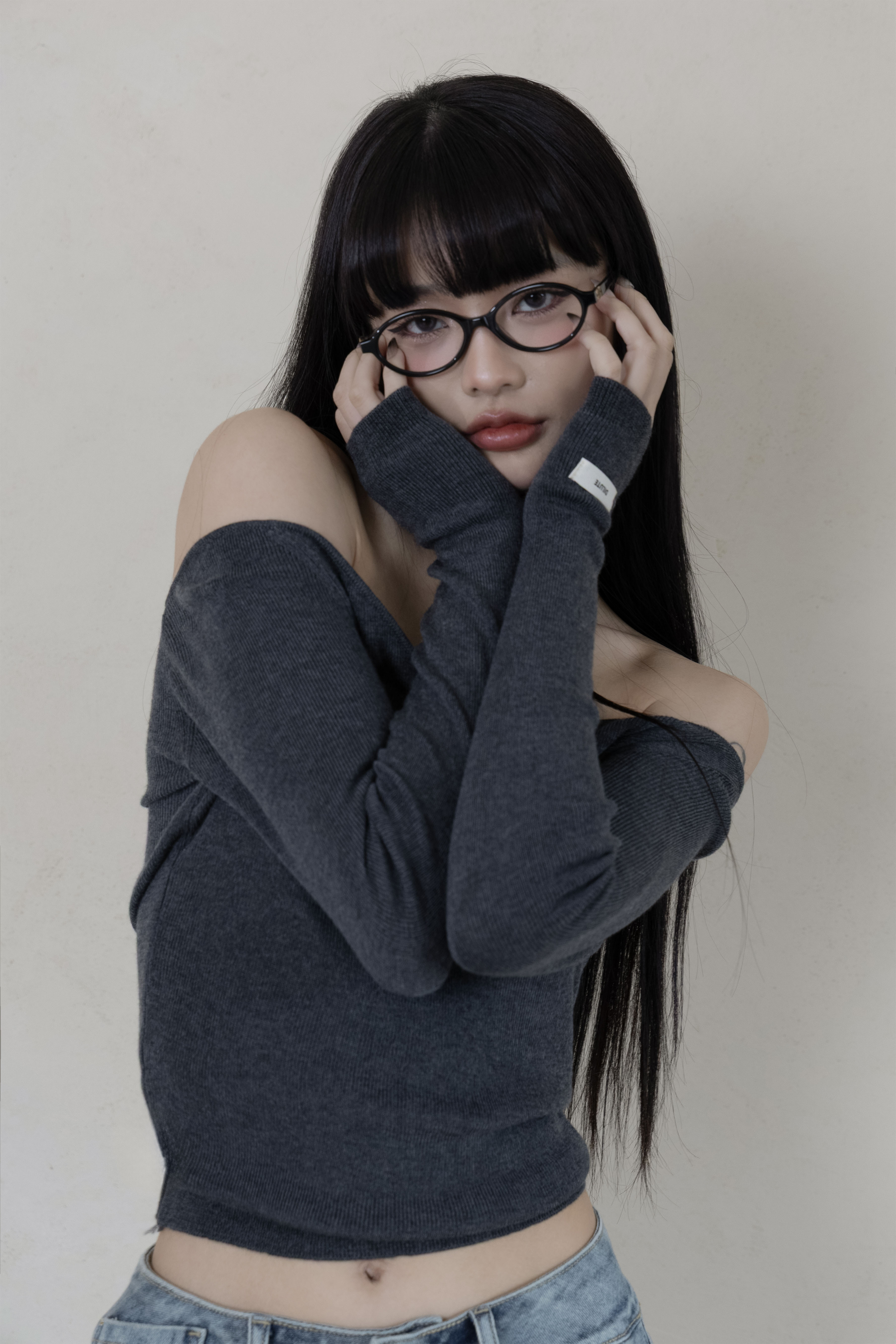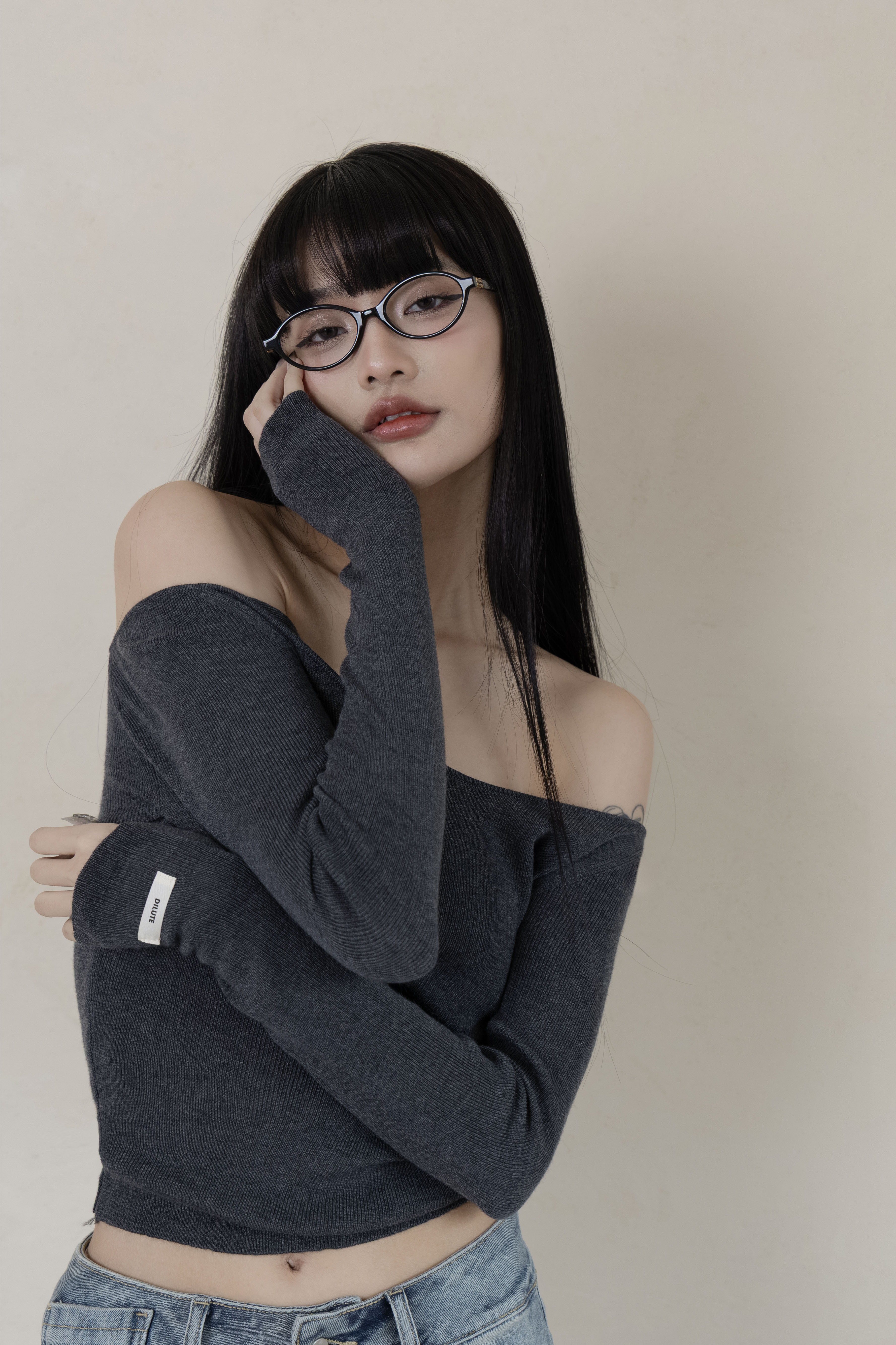 A calm, dark grey hue meets soft knit fabric in an off-shoulder design, interpreting an understated yet sophisticated mood.