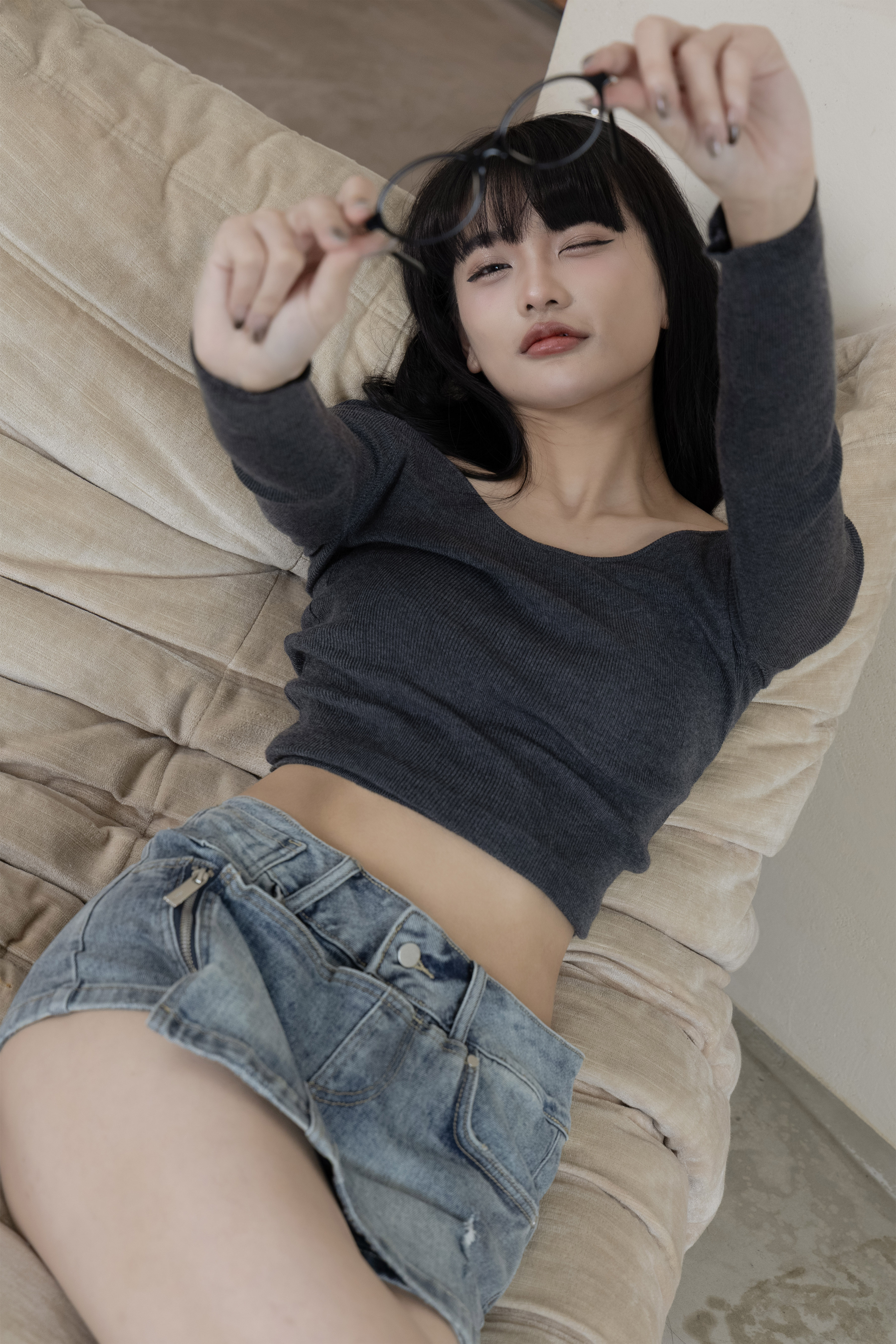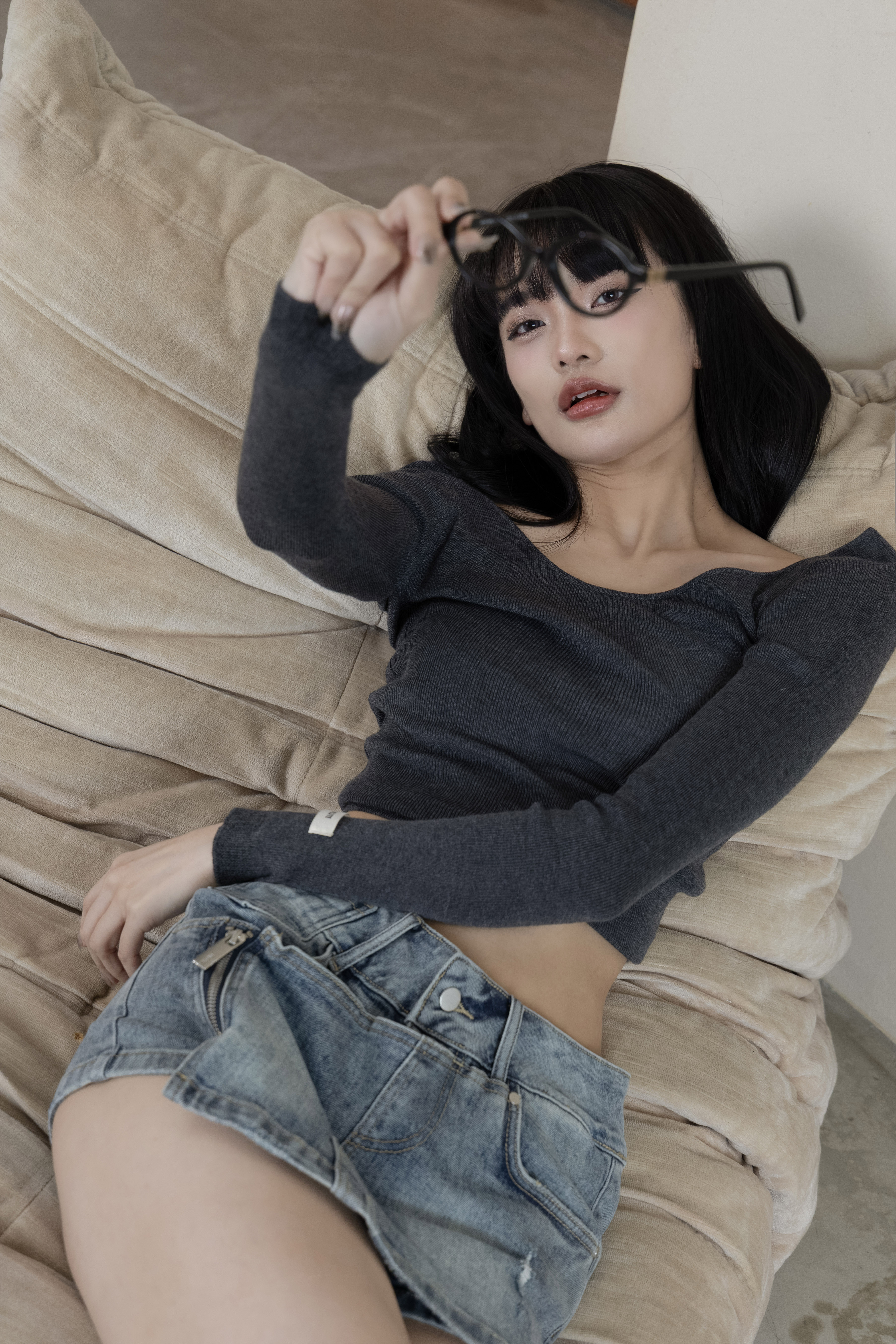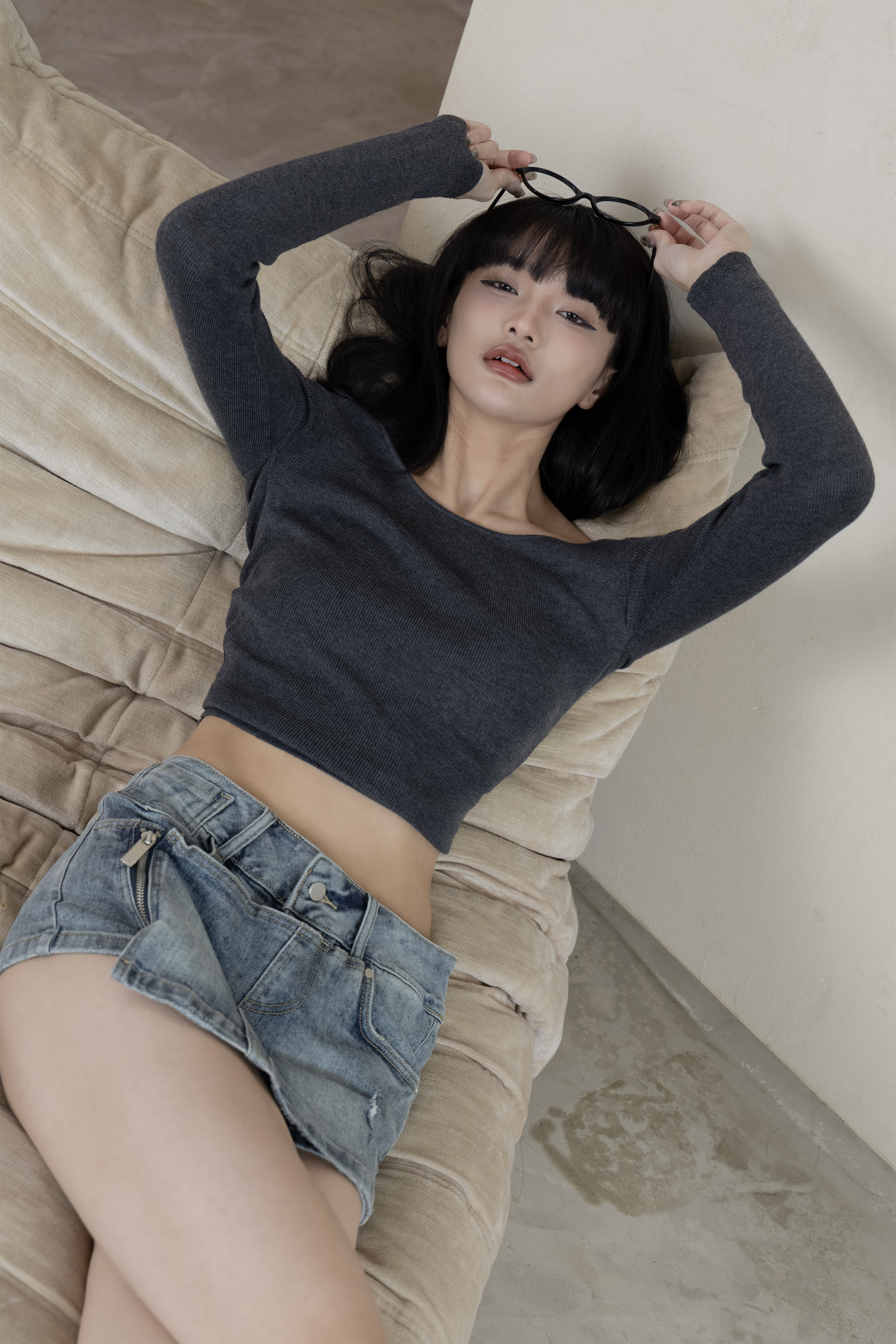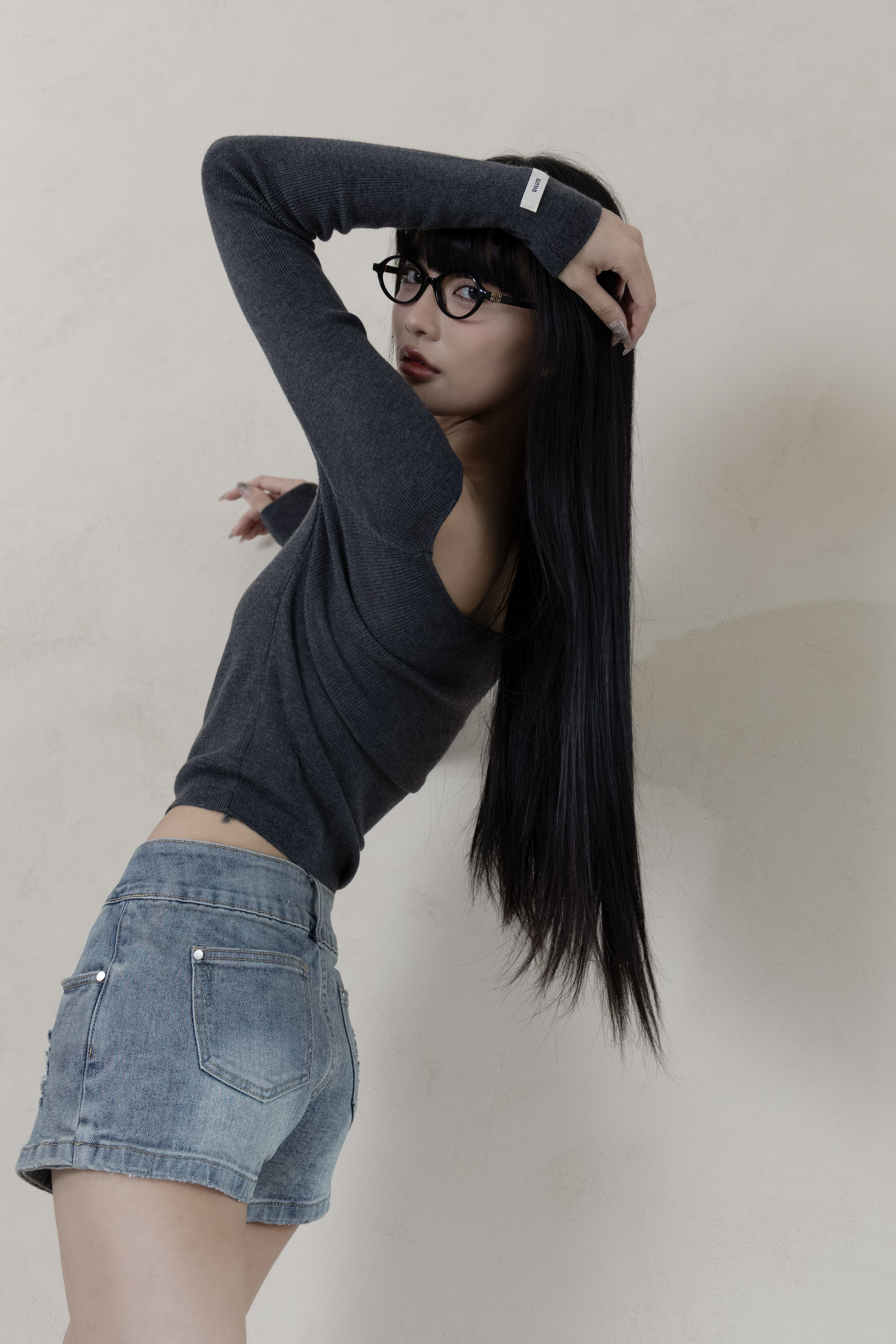 A calm, dark grey hue meets soft knit fabric in an off-shoulder design, interpreting an understated yet sophisticated mood.