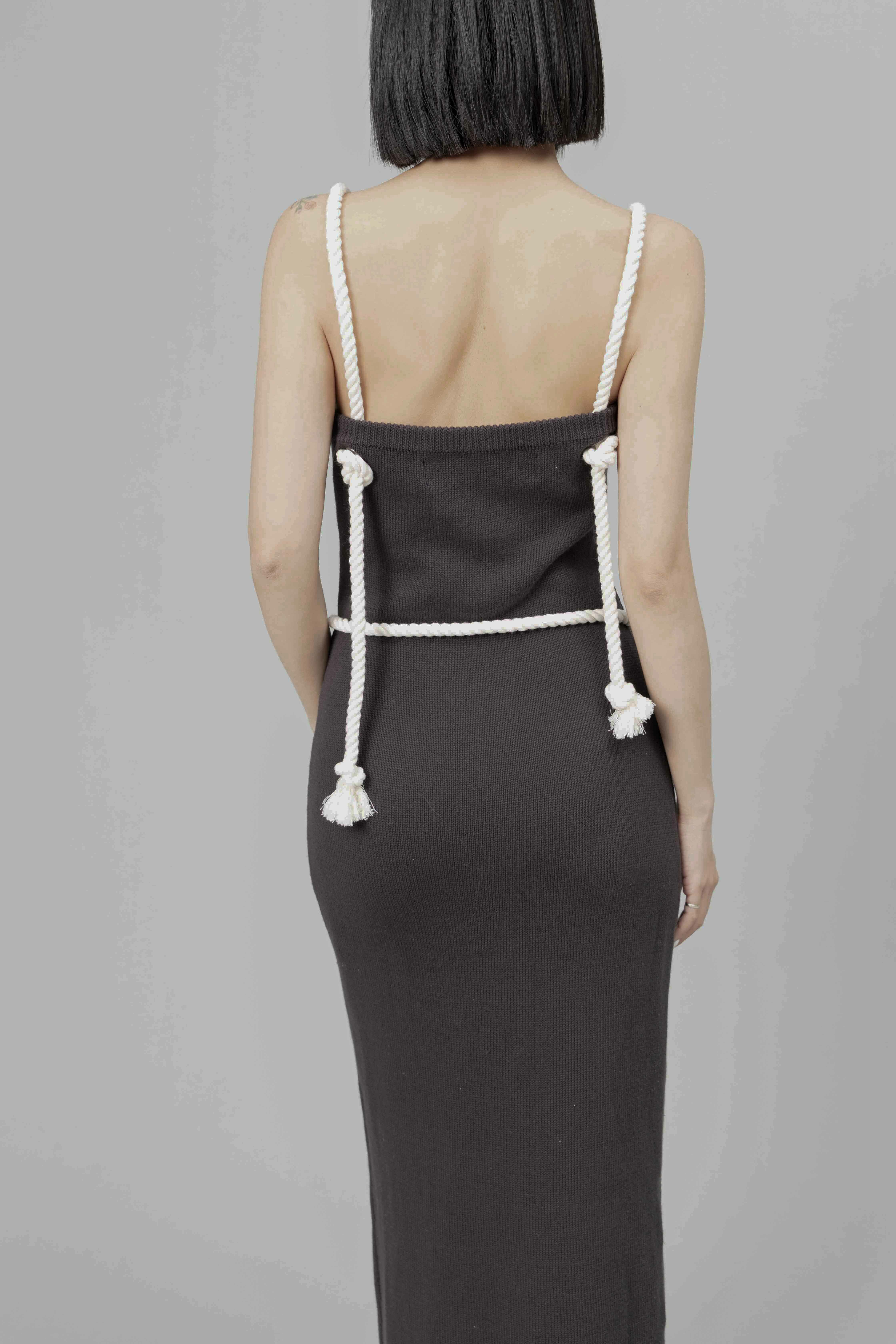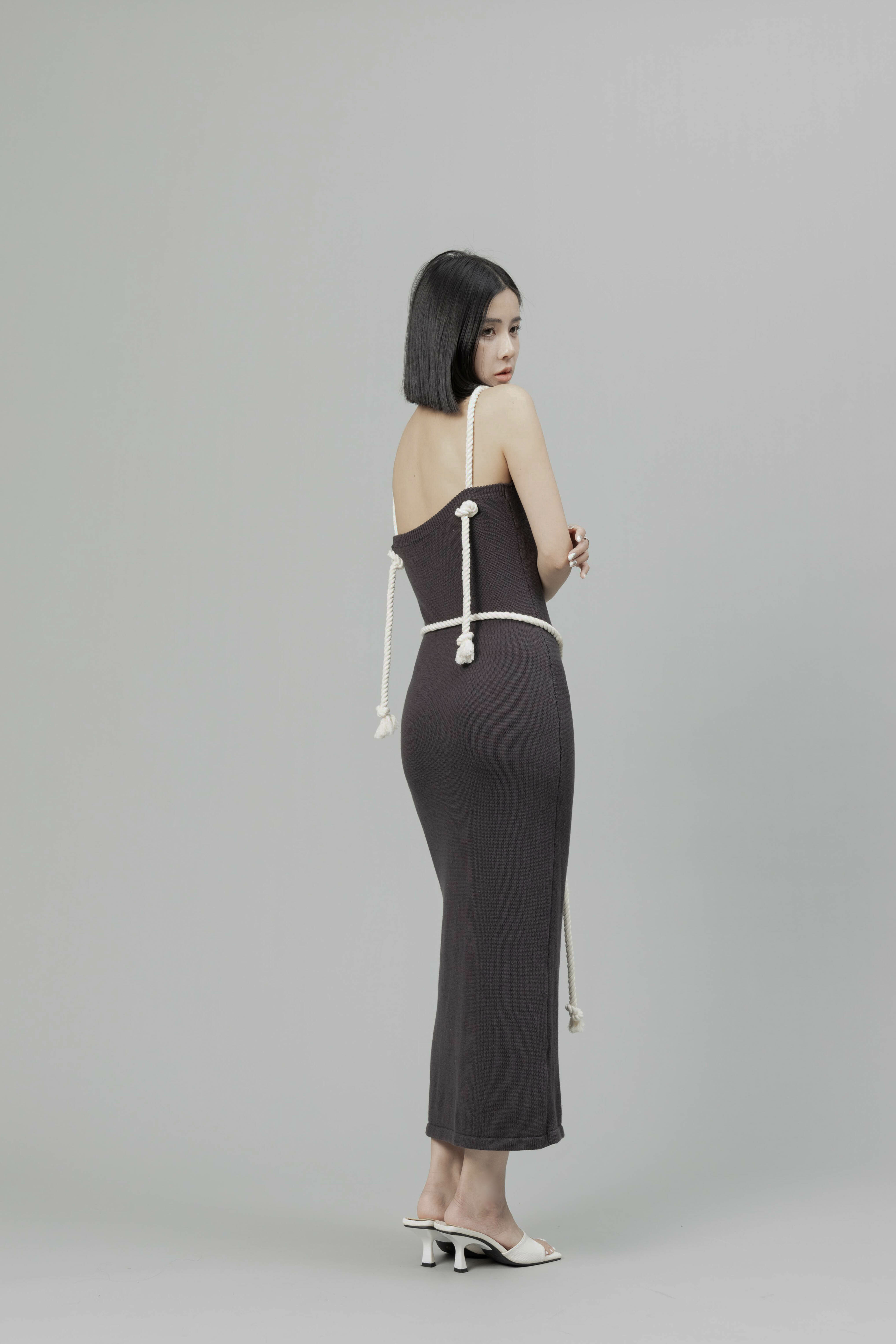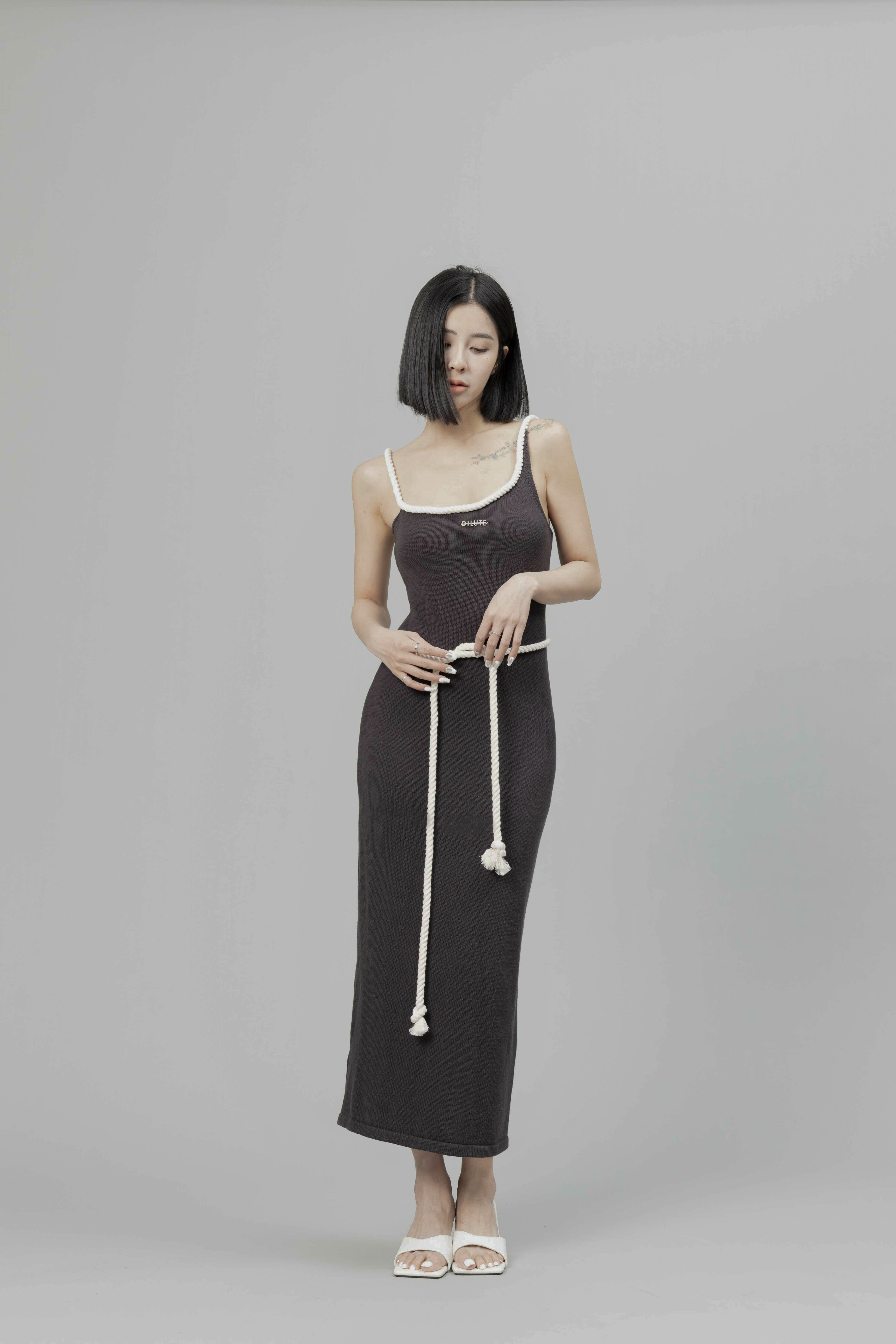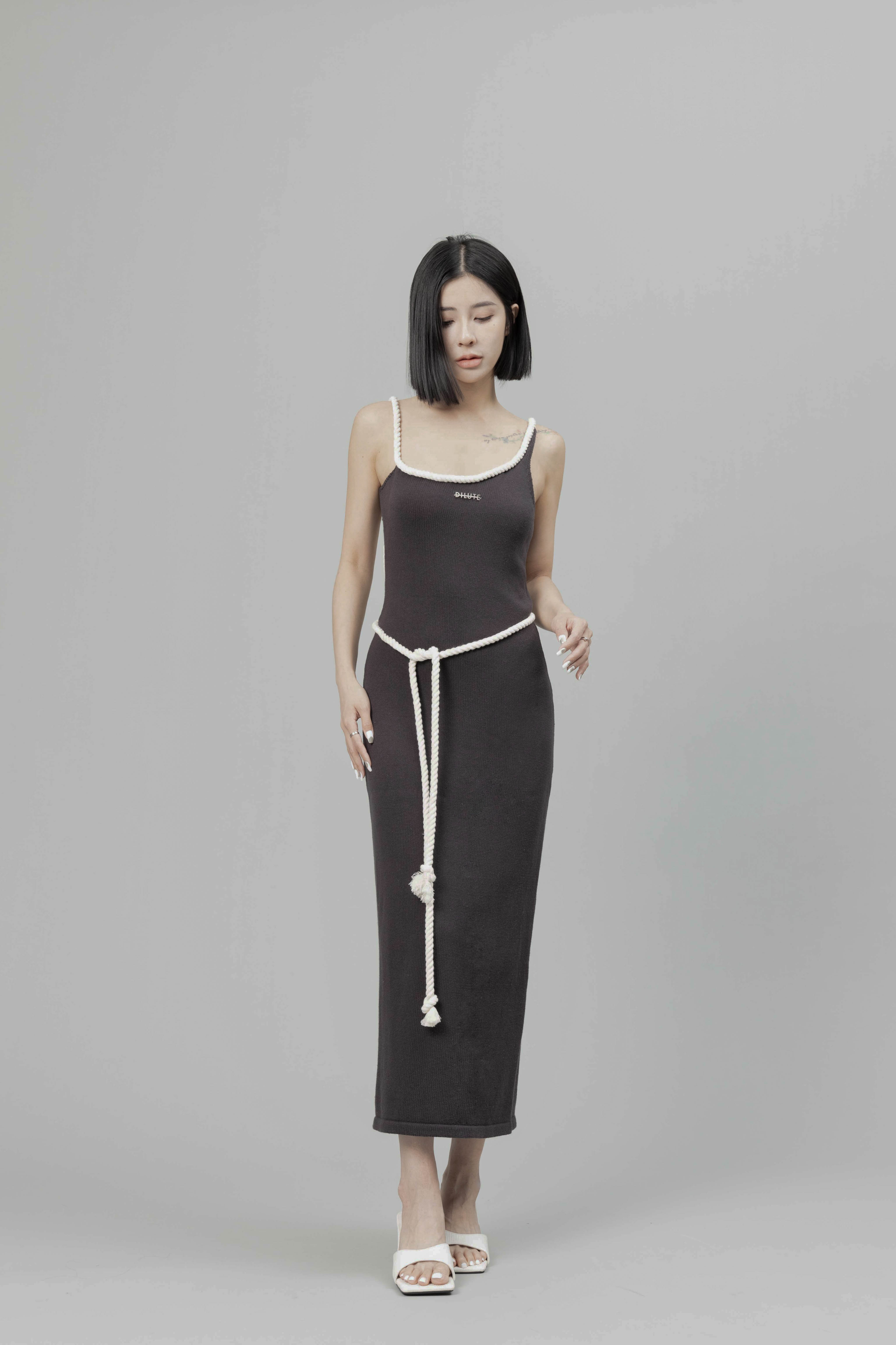 可調式麻繩肩帶設計、長版筒裙修飾身材、不對稱領口