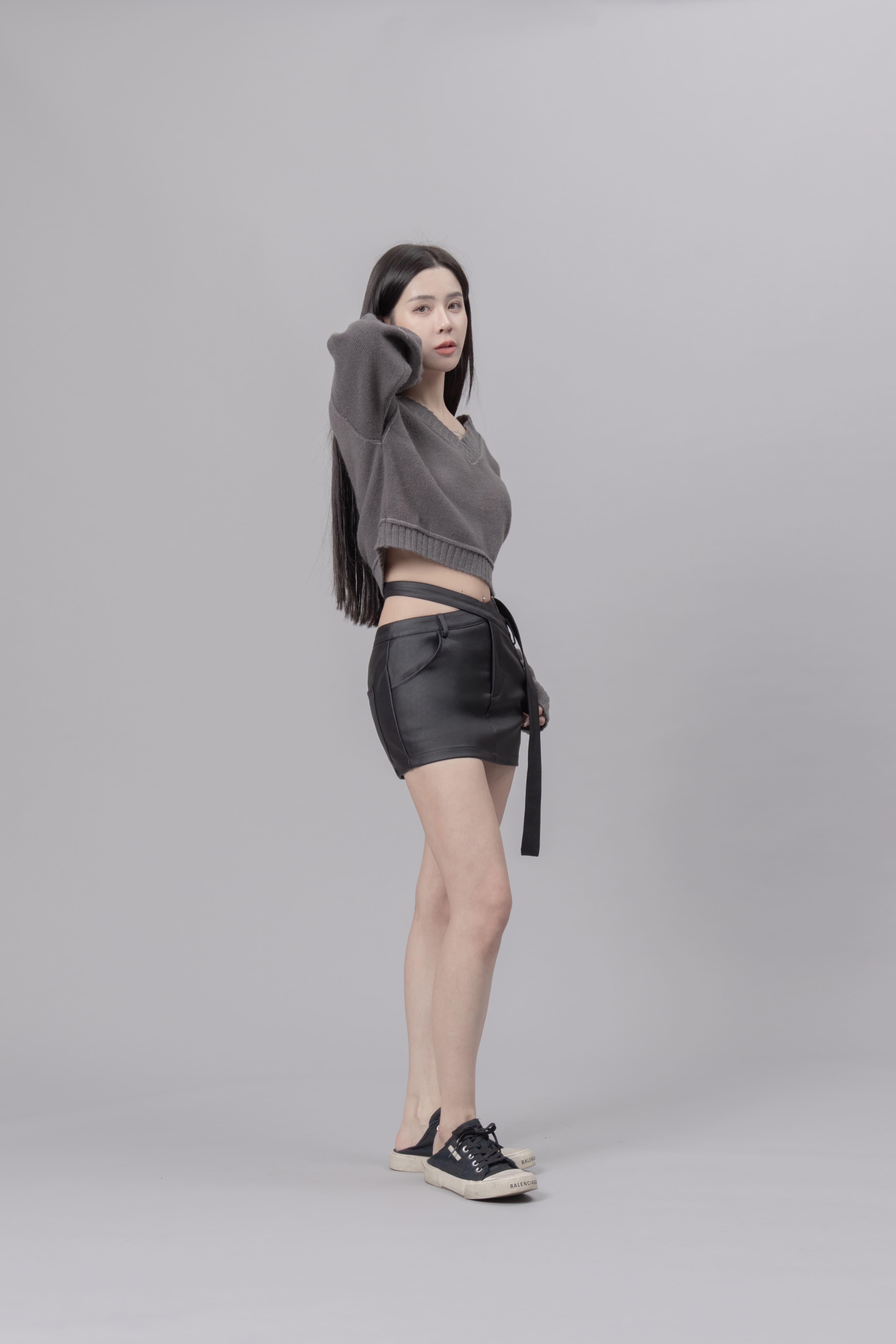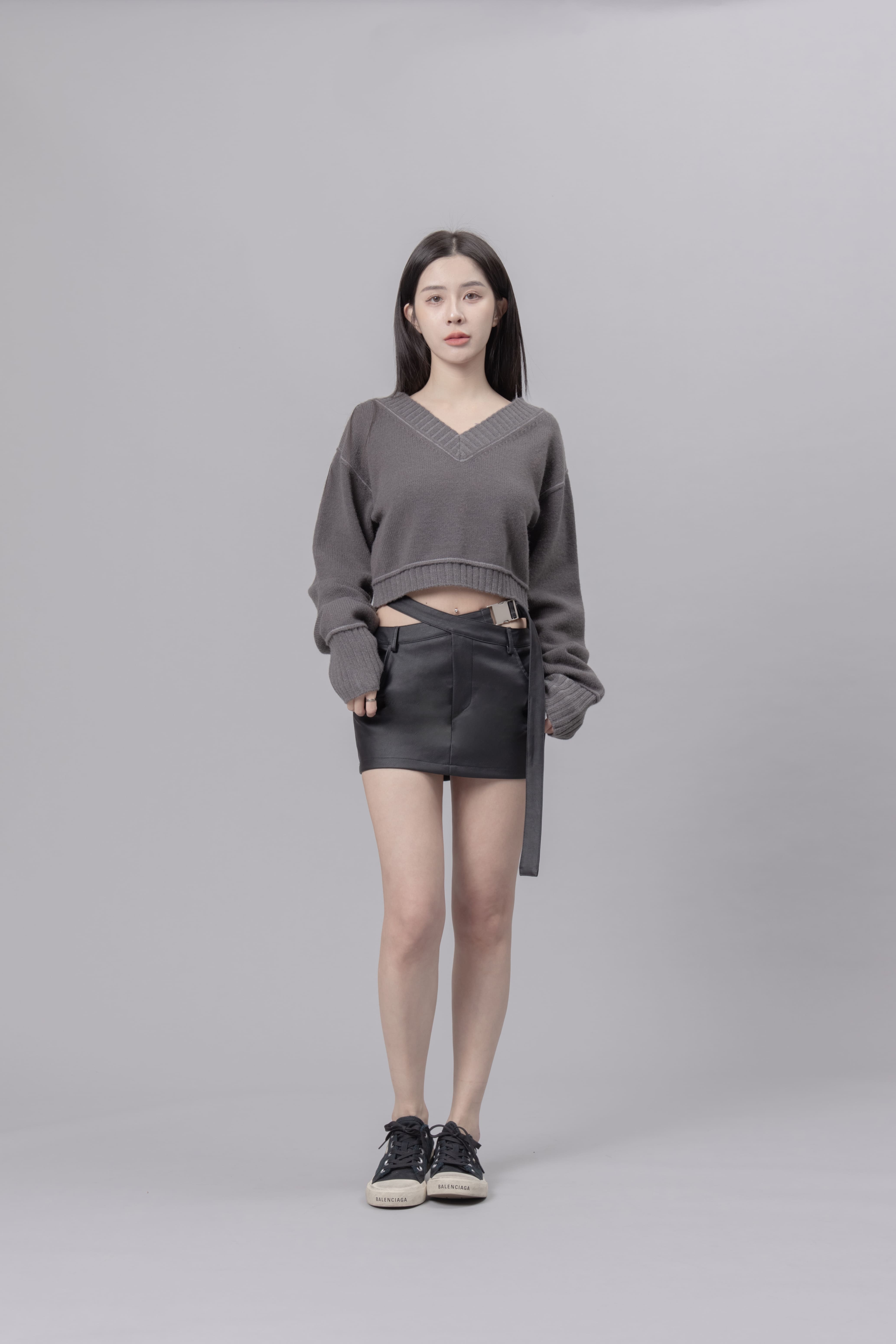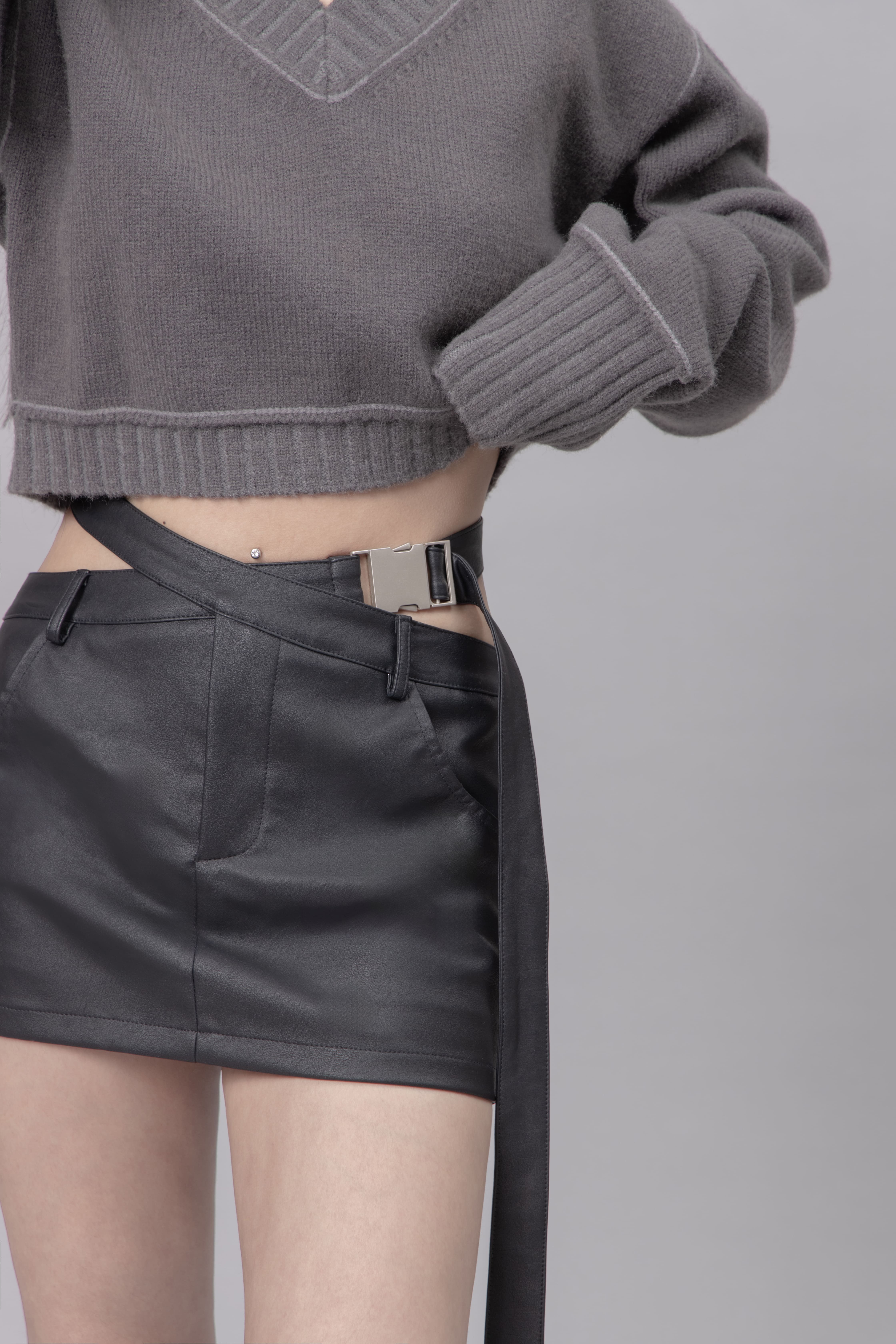 交叉腰帶設計、可調節金屬插扣、簍空設計、後大口袋、低腰短裙版型