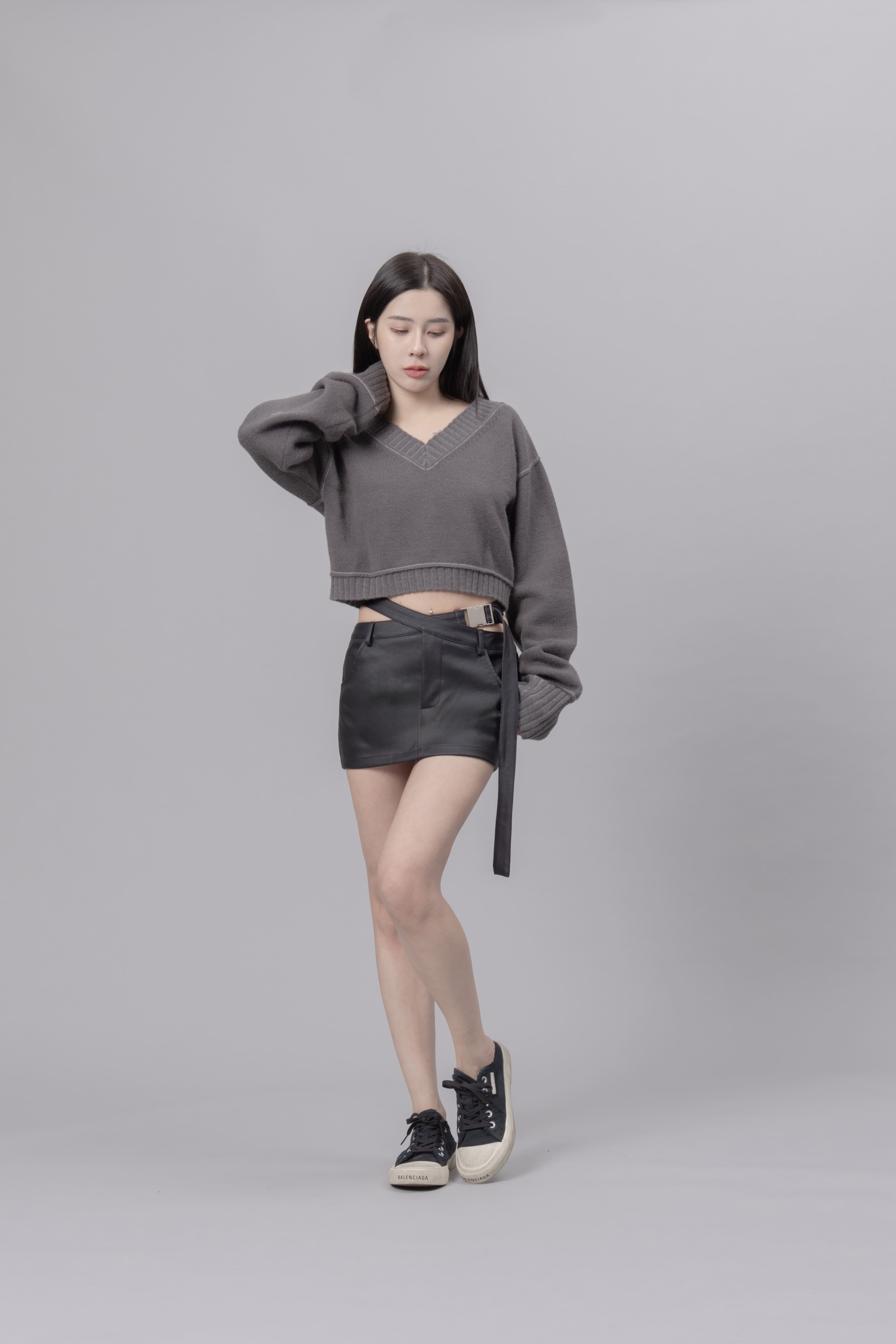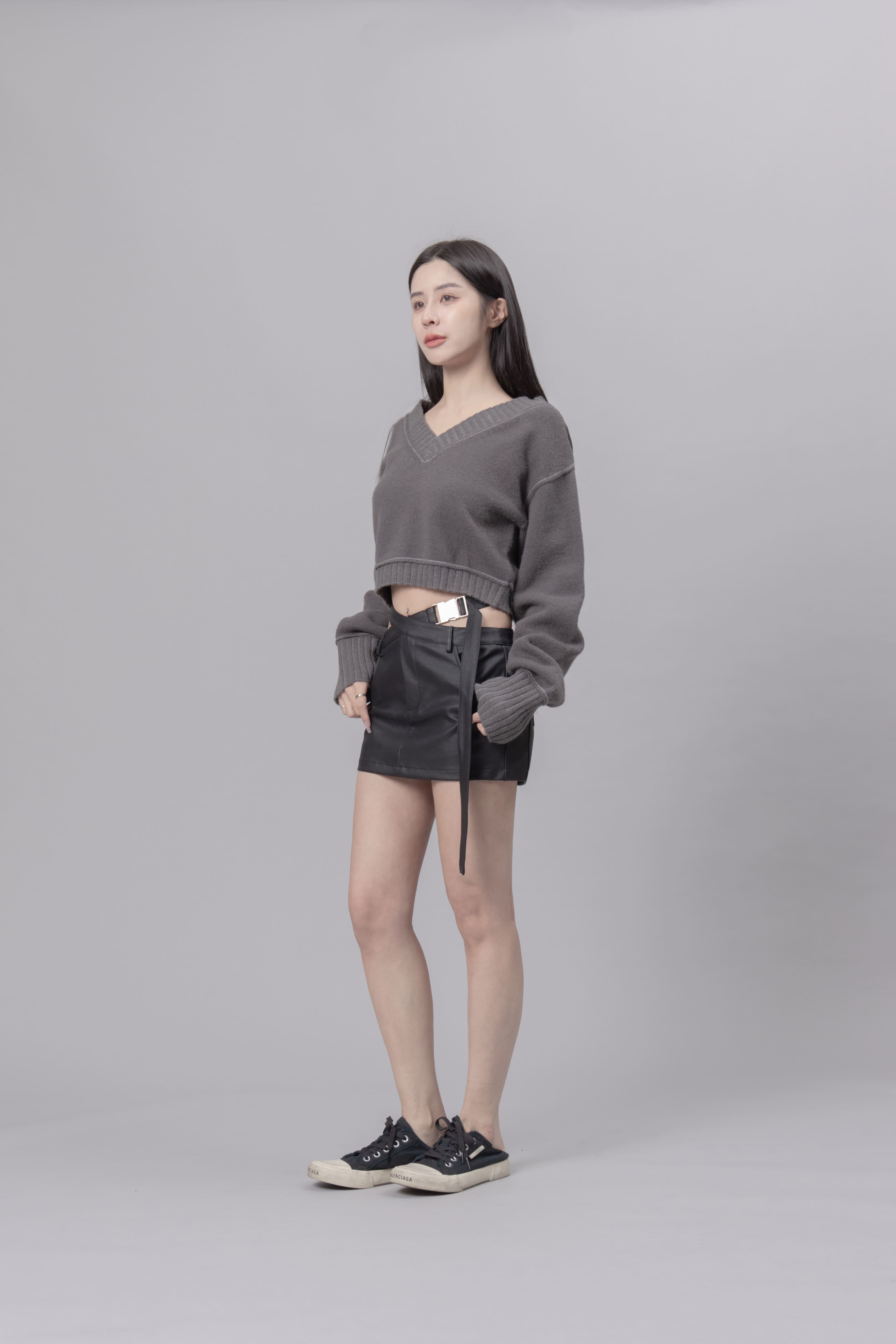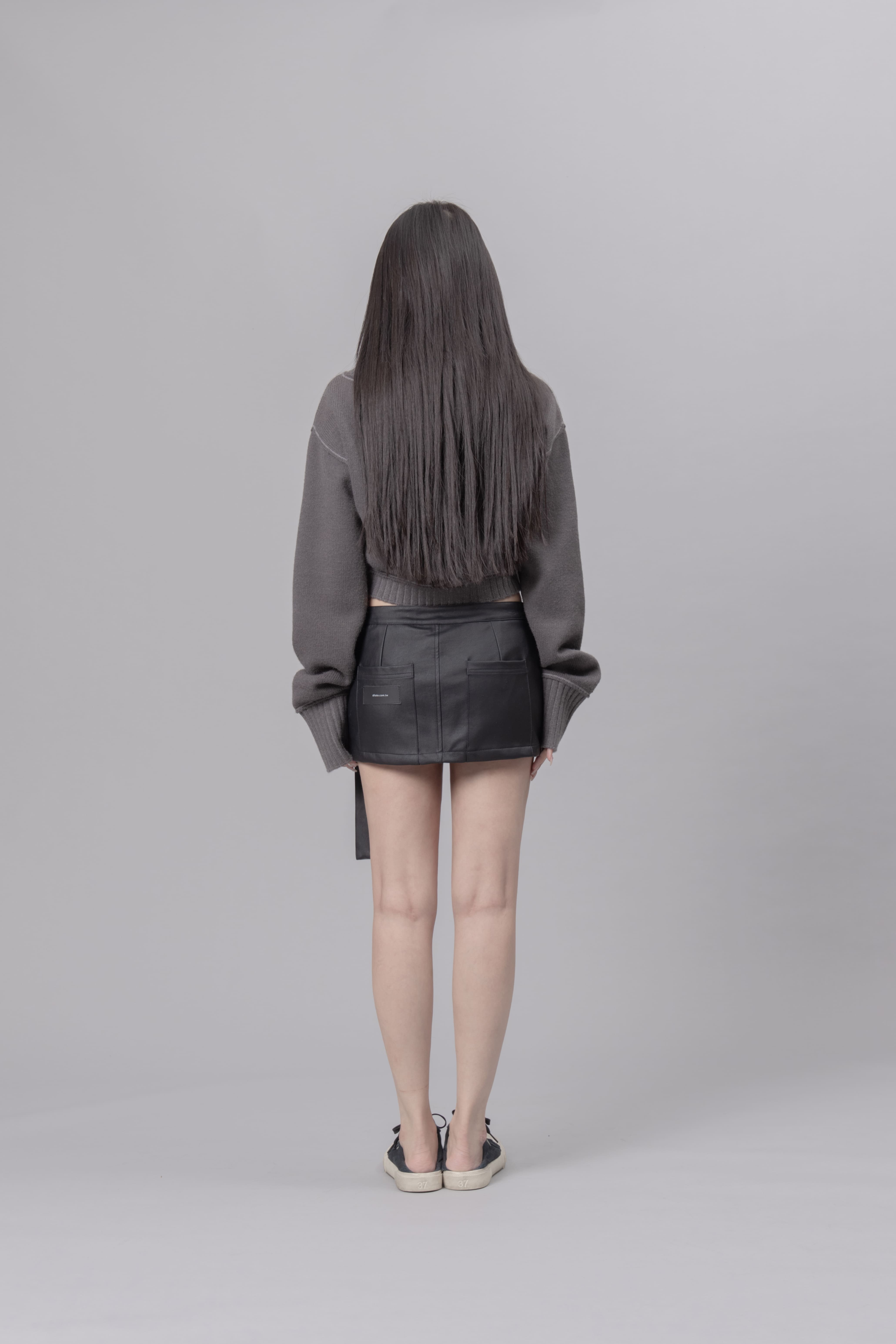 交叉腰帶設計、可調節金屬插扣、簍空設計、後大口袋、低腰短裙版型