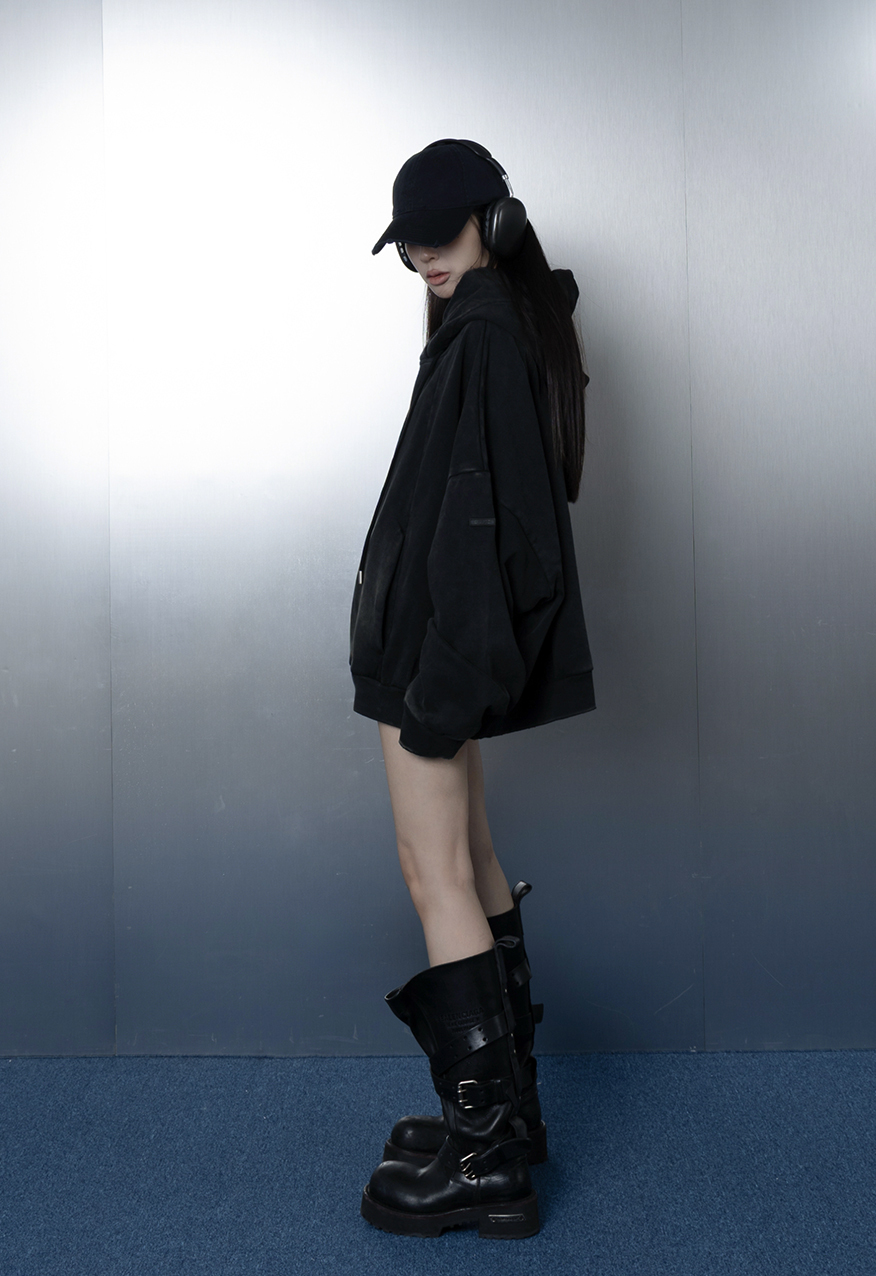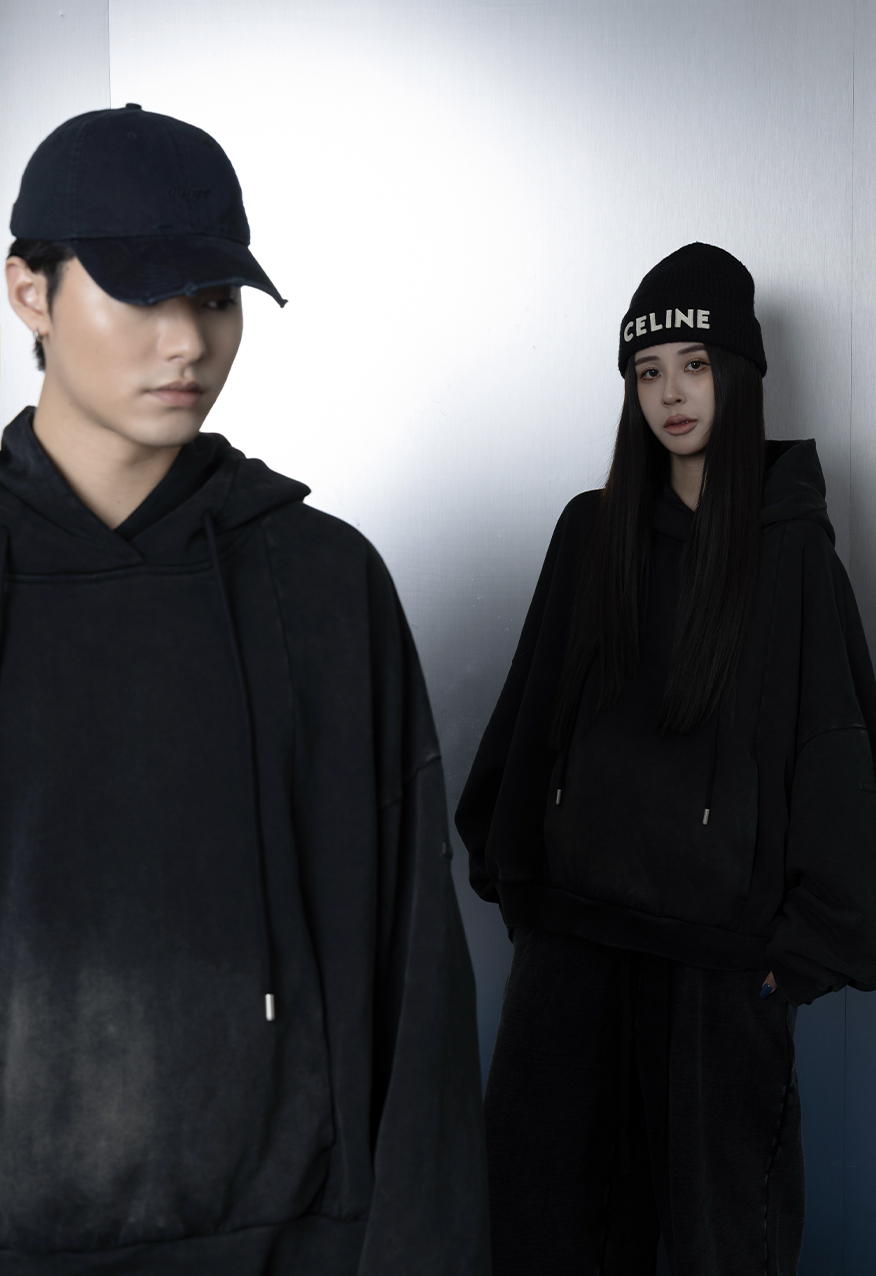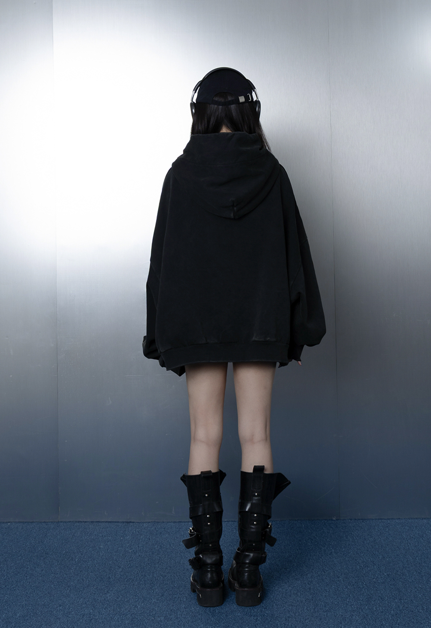 AW1111-厚磅水洗做舊黑中性連帽衛衣