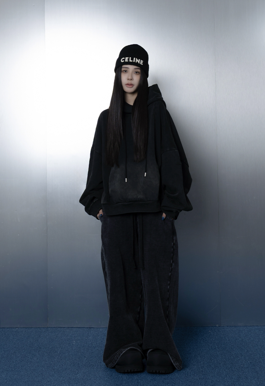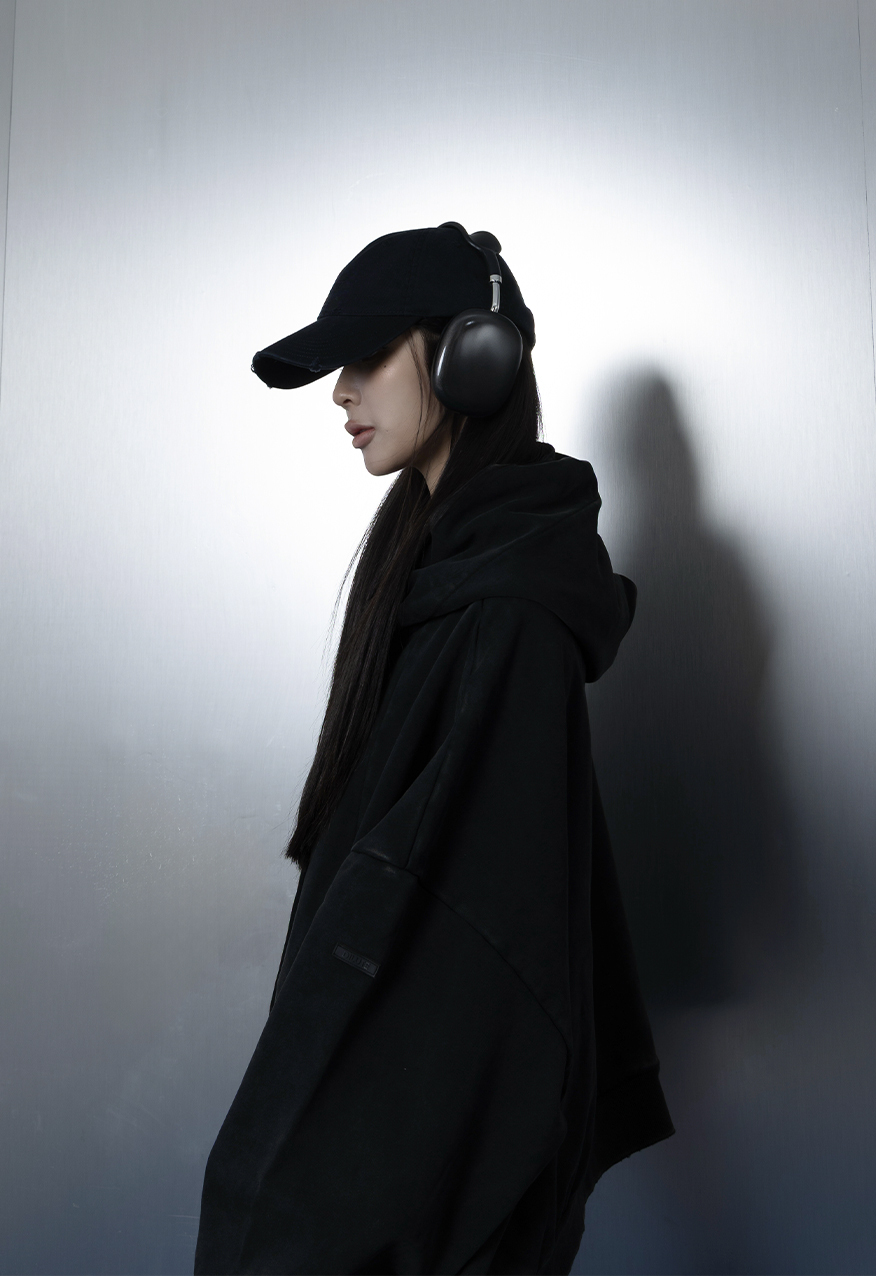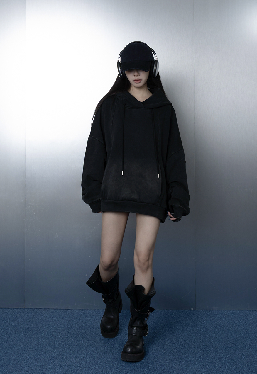 AW1111-厚磅水洗做舊黑中性連帽衛衣