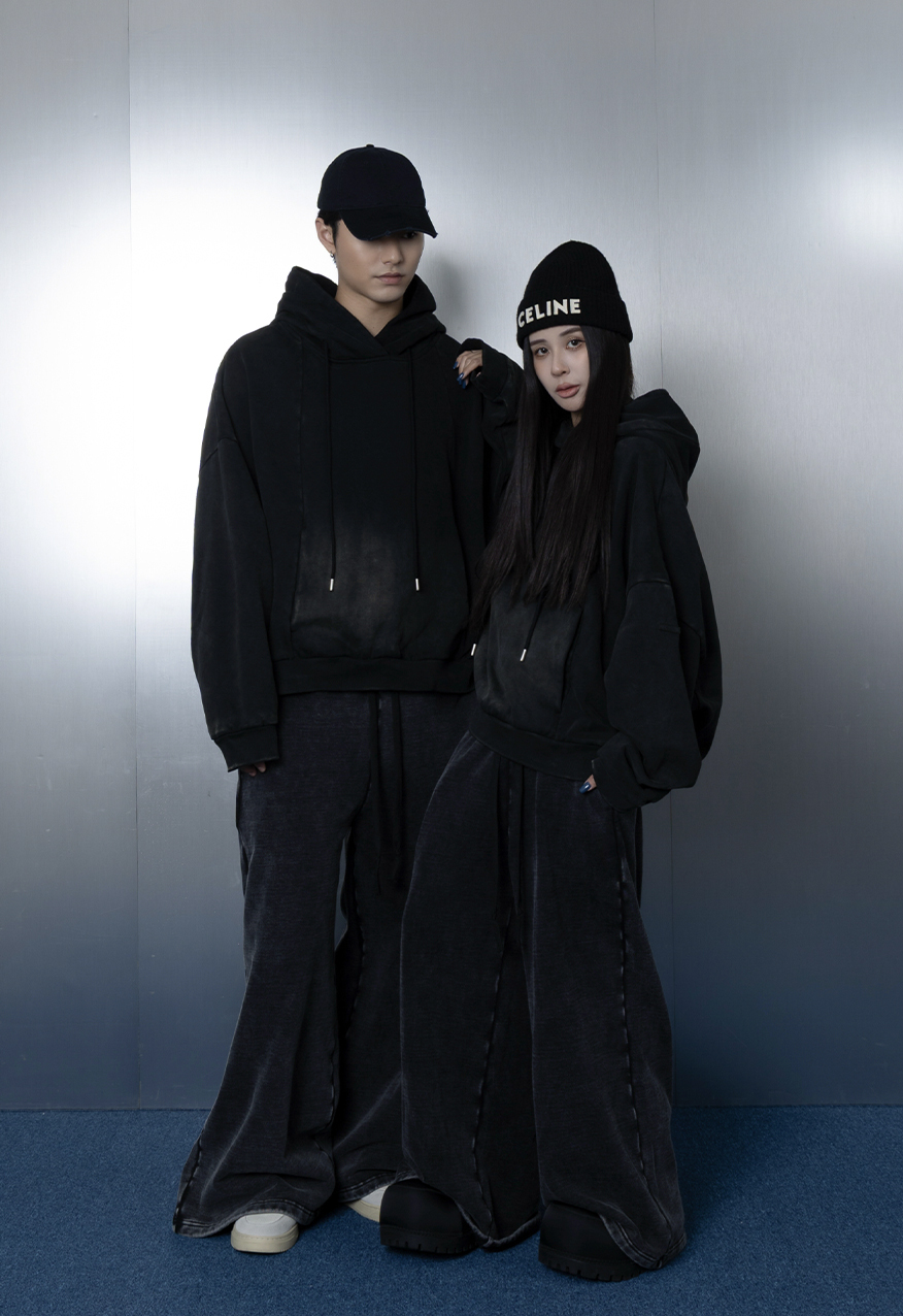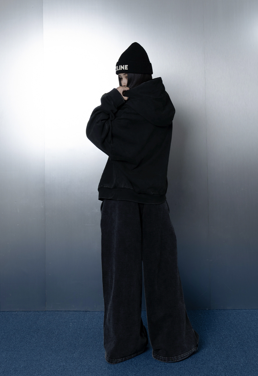 AW1111-厚磅水洗做舊黑中性連帽衛衣