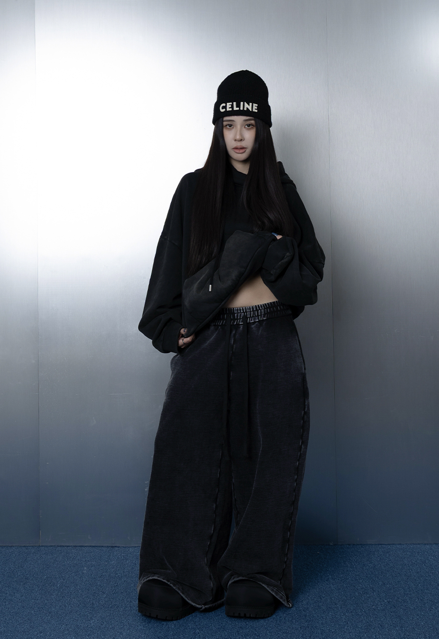 AW1176-厚磅水洗做舊黑中性寬鬆衛褲