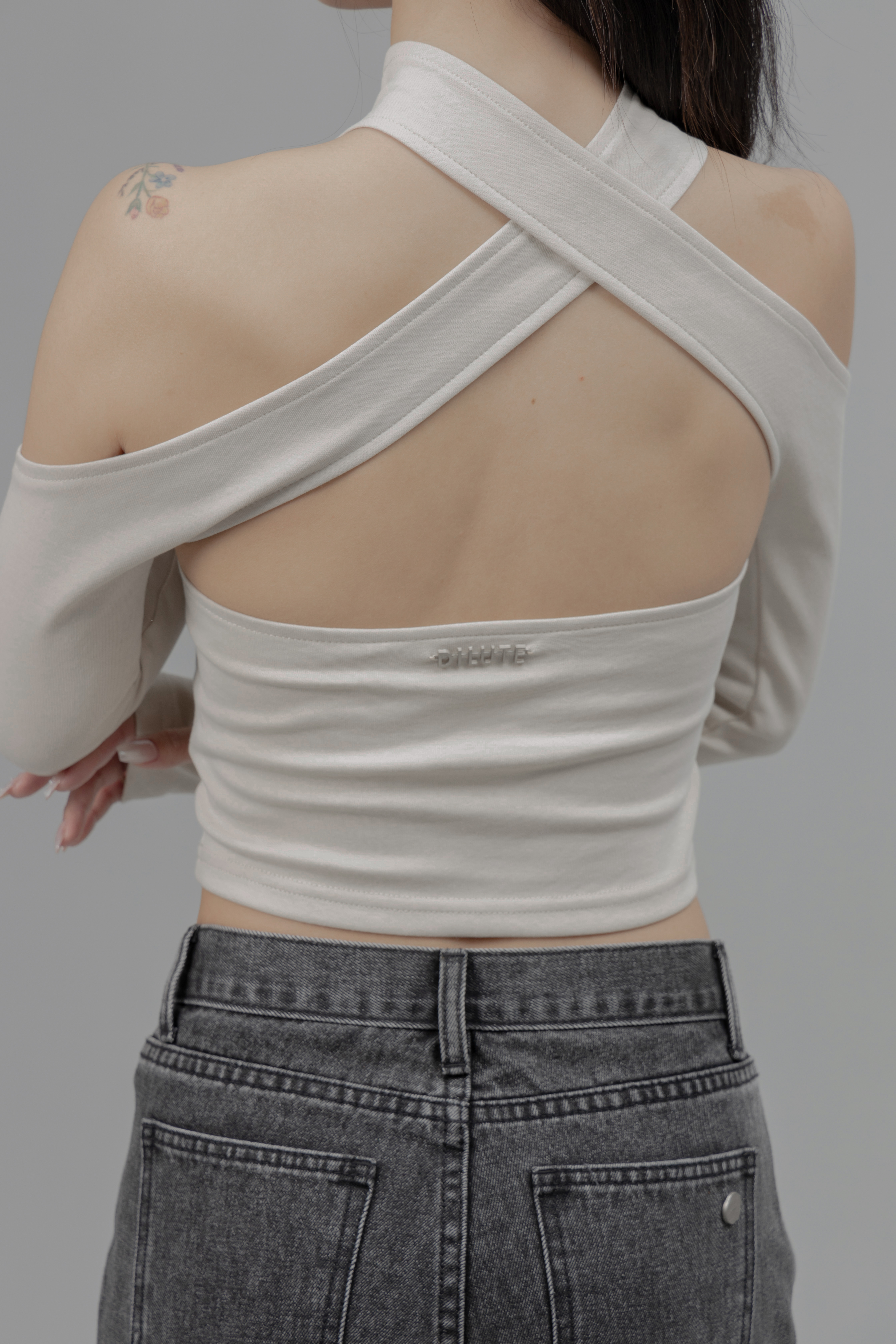 美背後交叉設計、不規則拼接造型、挖洞效果加乘