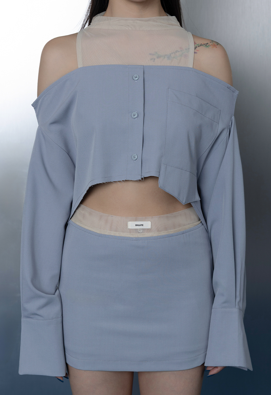 AW1106-天空藍網紗拼接襯衫裙