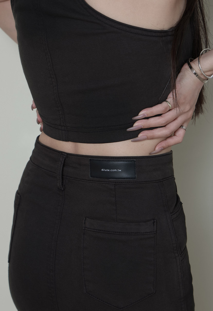 高腰剪裁、前開衩設計、修身直筒版型