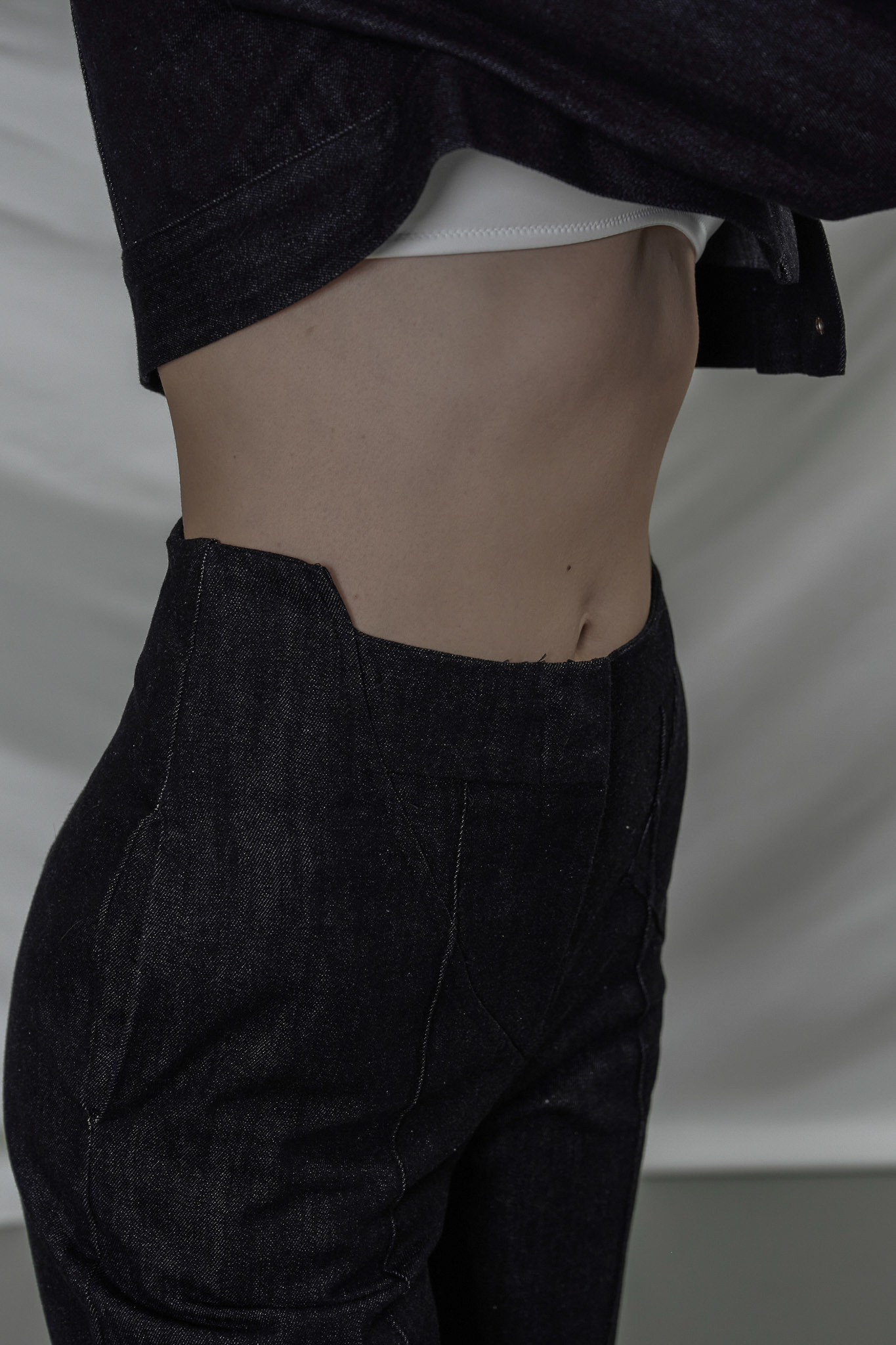 不規則斜切腰頭、細節剪接線、直筒修身、硬挺丹寧布