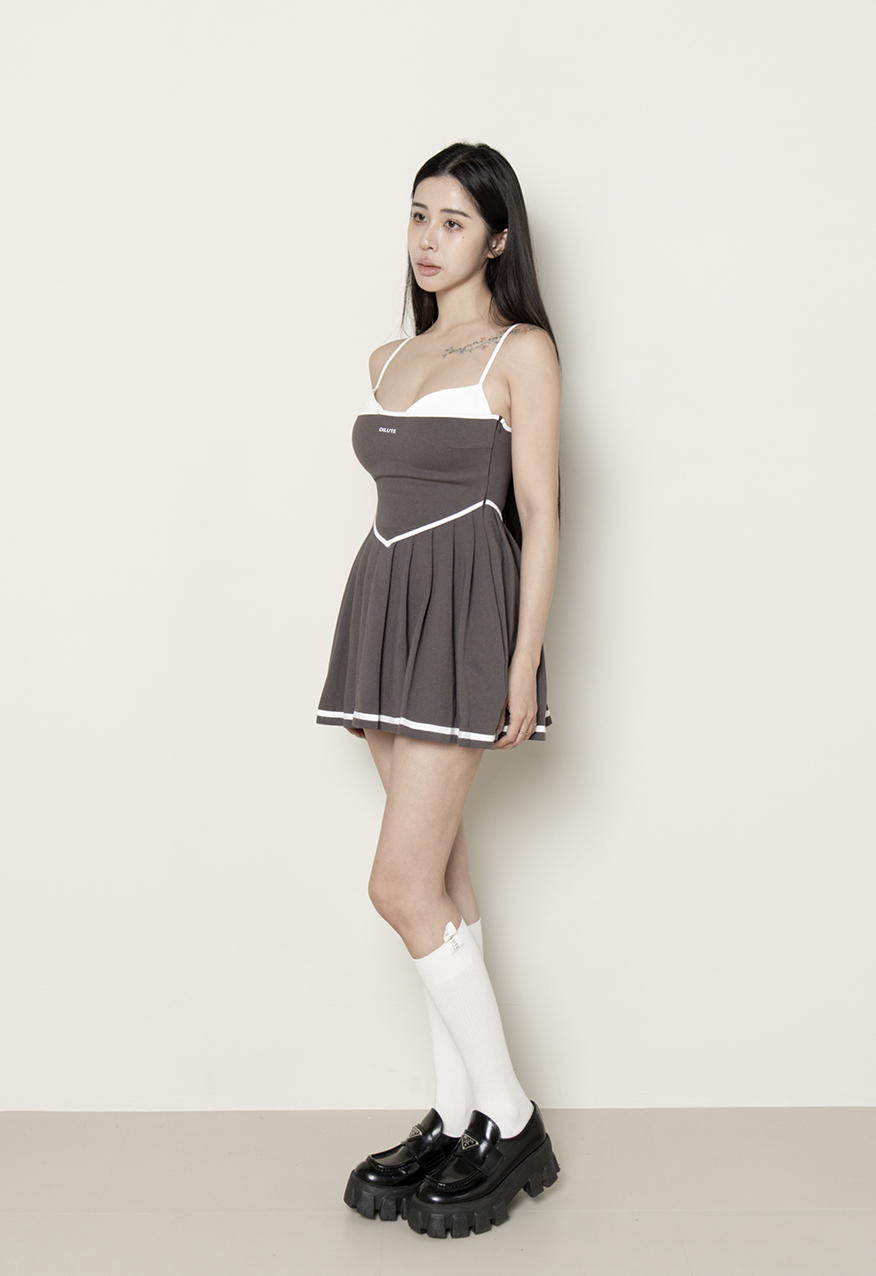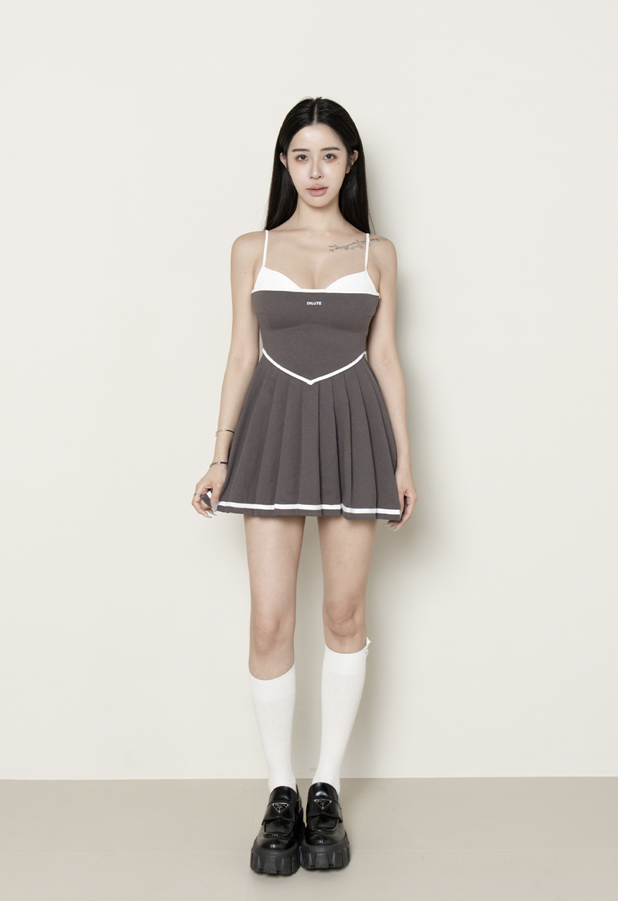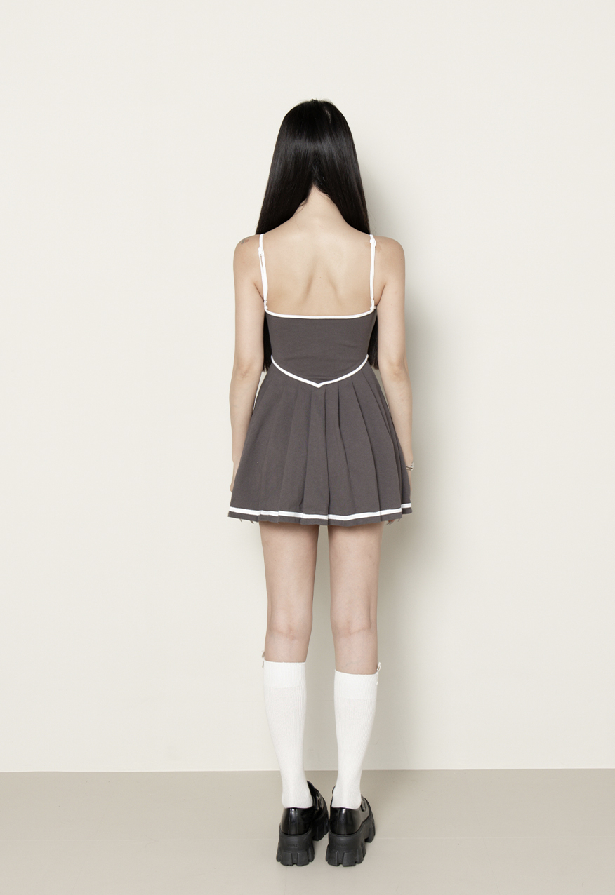 短版吊帶百褶洋裝、心型領設計、白色滾邊細節、俏皮學院風格