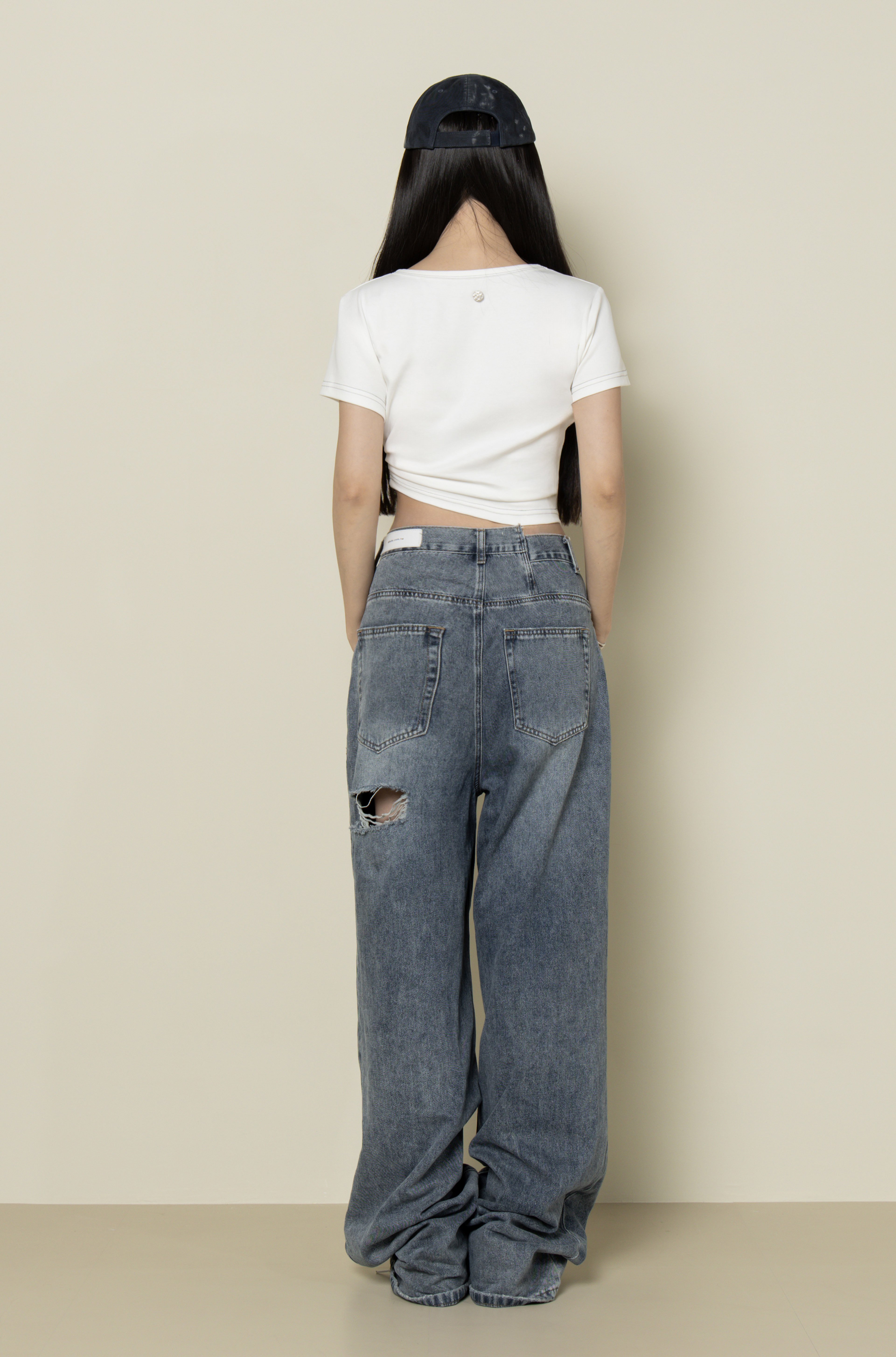 品牌釘釦、短版剪裁、高彈性面料、單邊抓皺