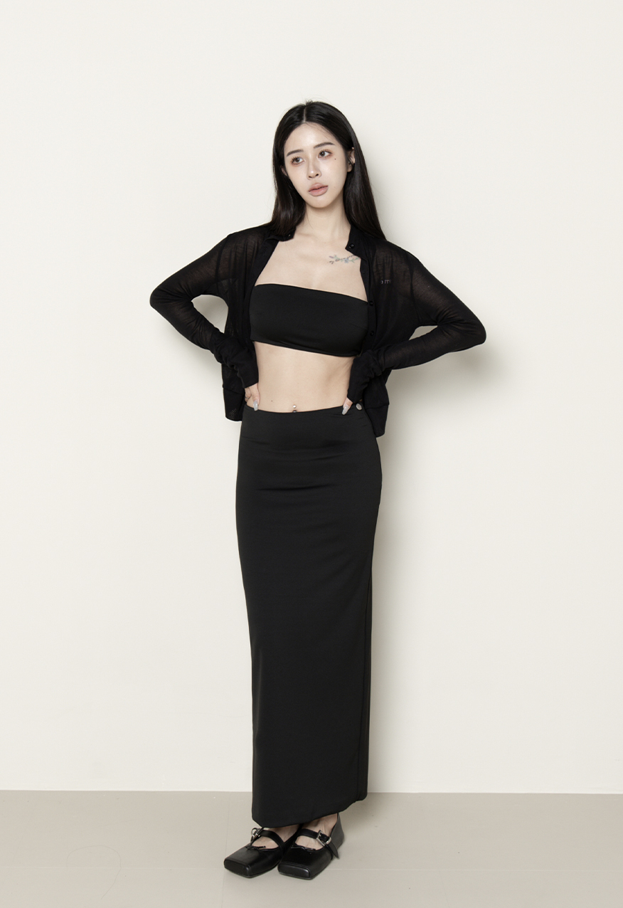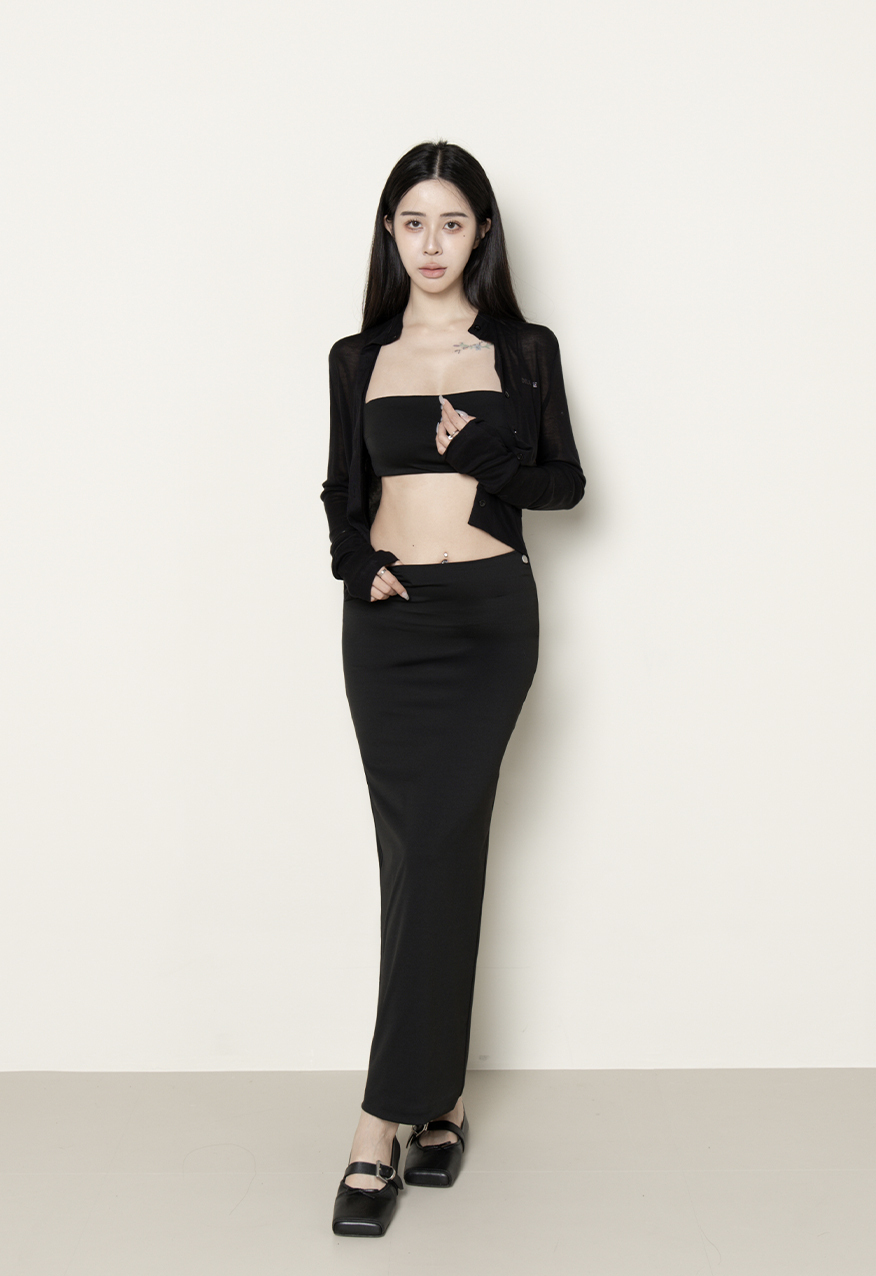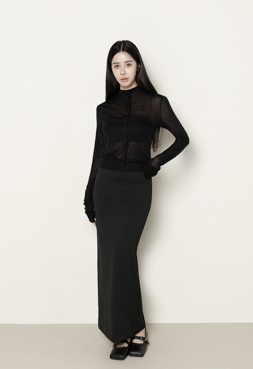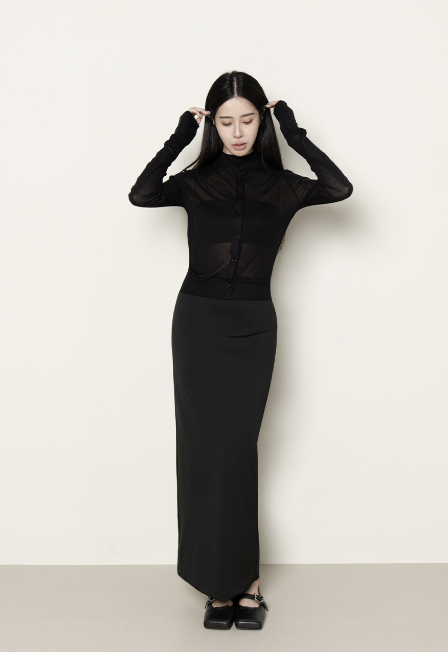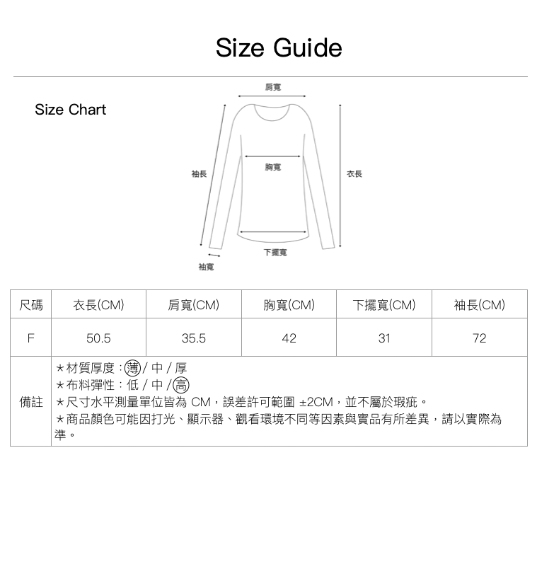 透膚輕薄、挺立立領、長袖修身、前排釦設計、品牌布標