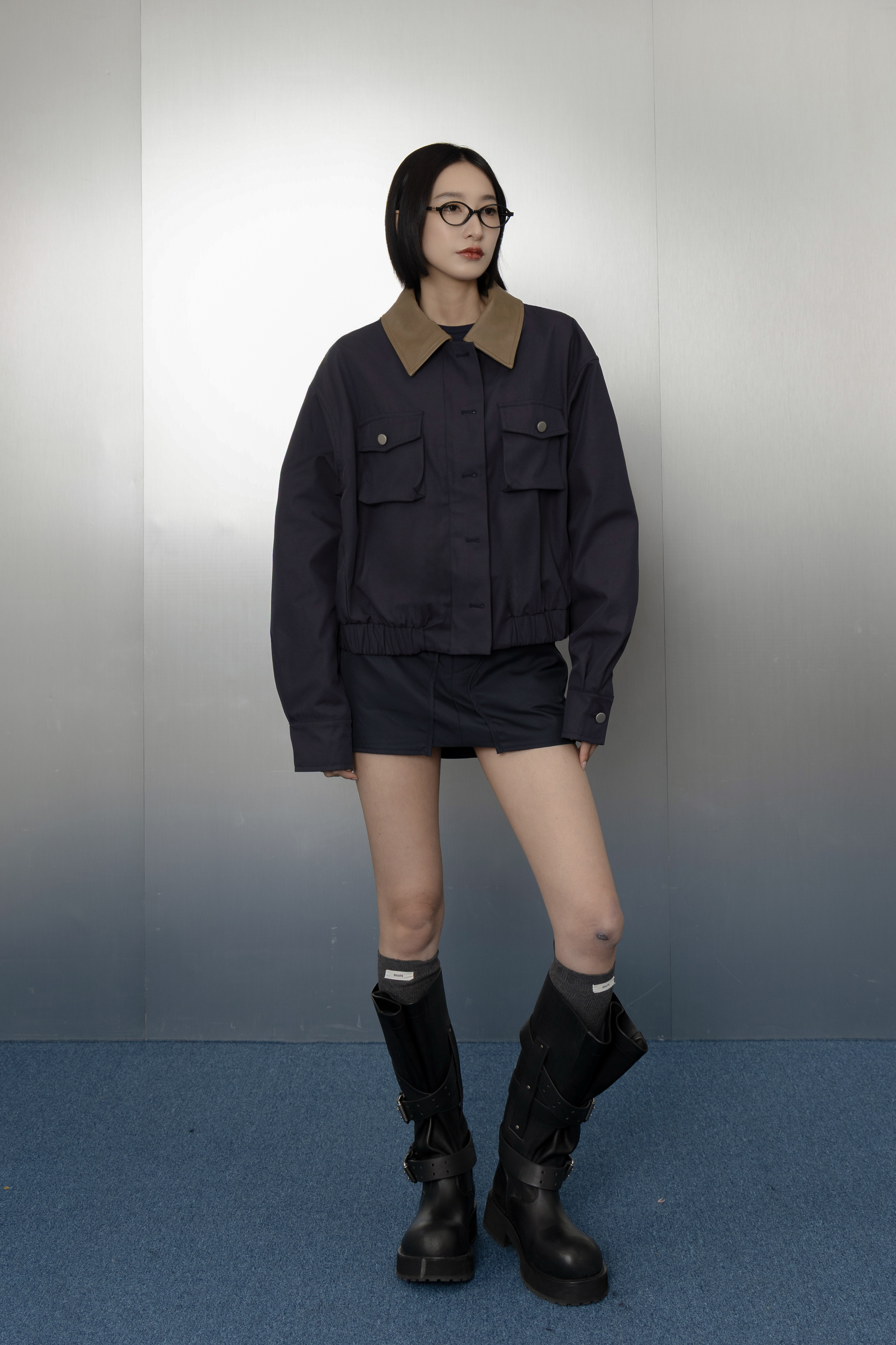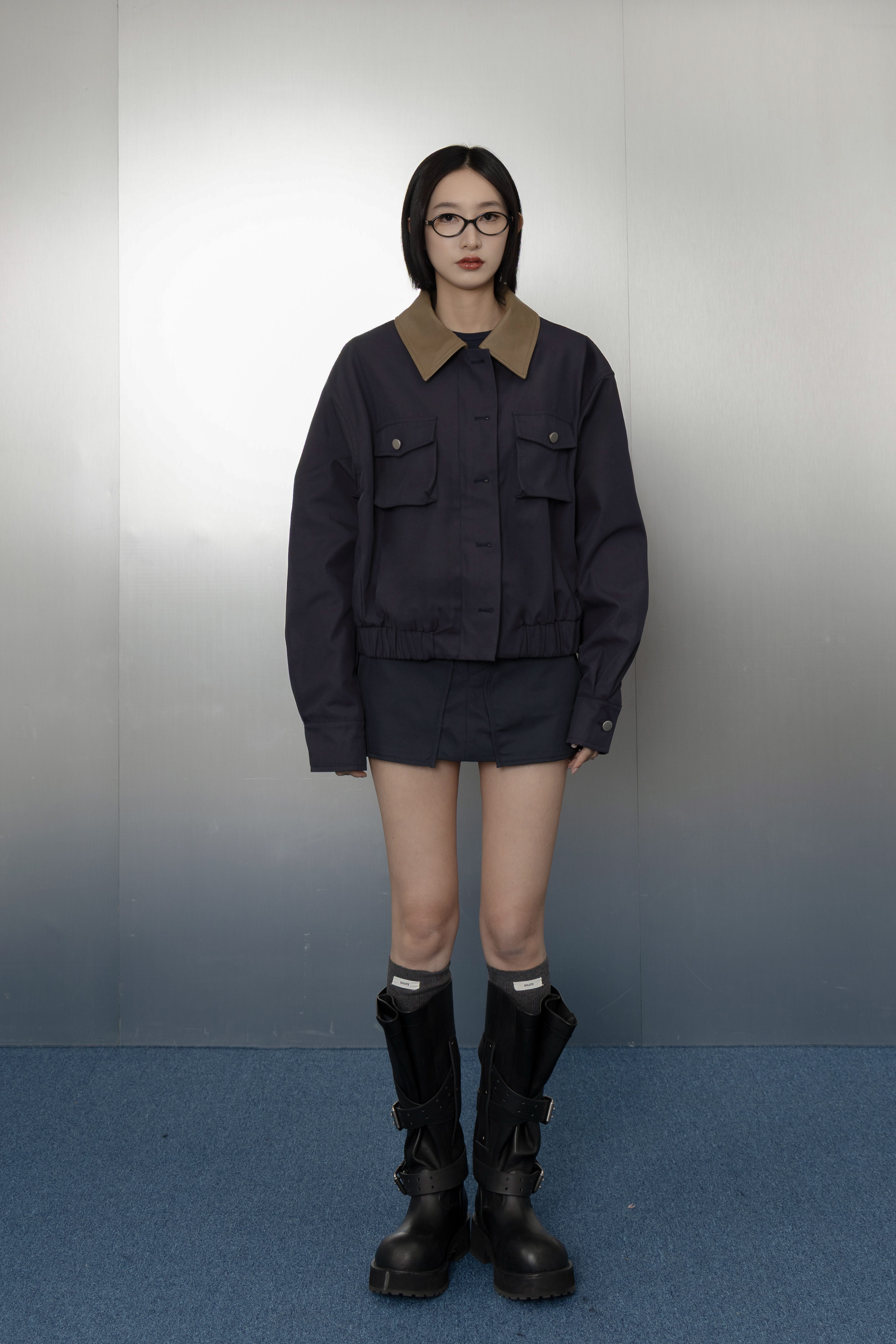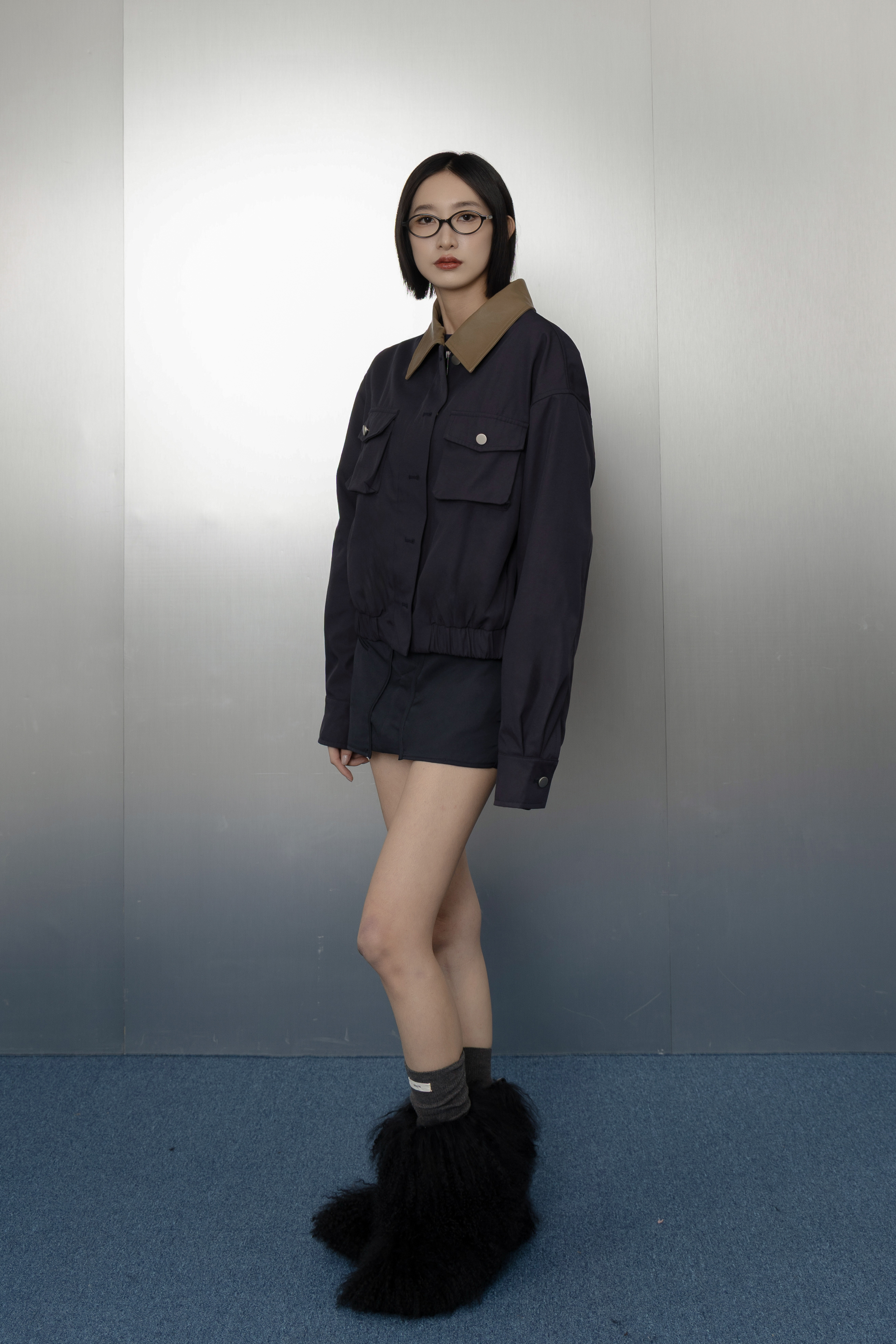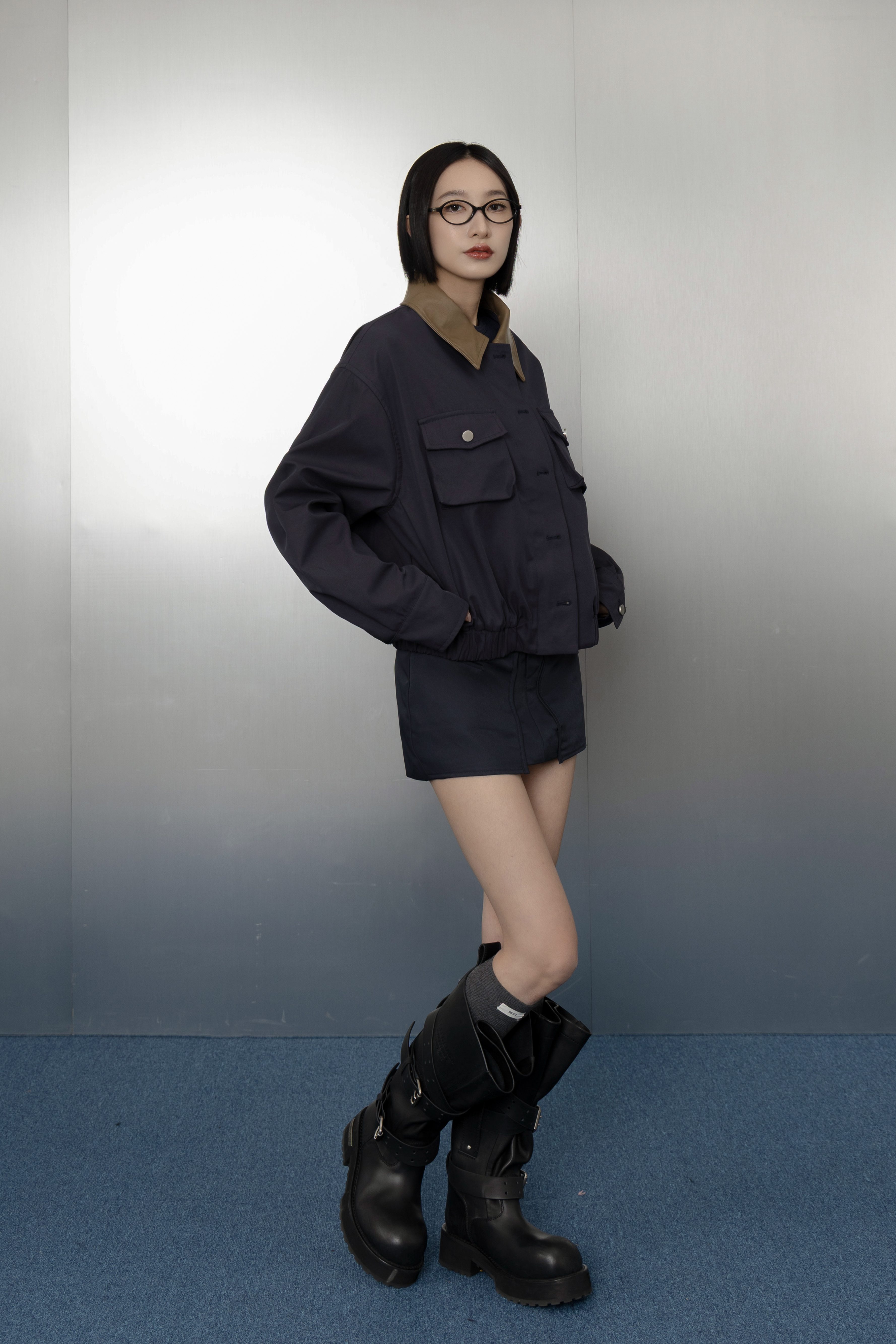 藍黑色的主調與溫潤的棕色領子碰撞,俐落的廓形剪裁輕鬆打造亮眼街頭風格。