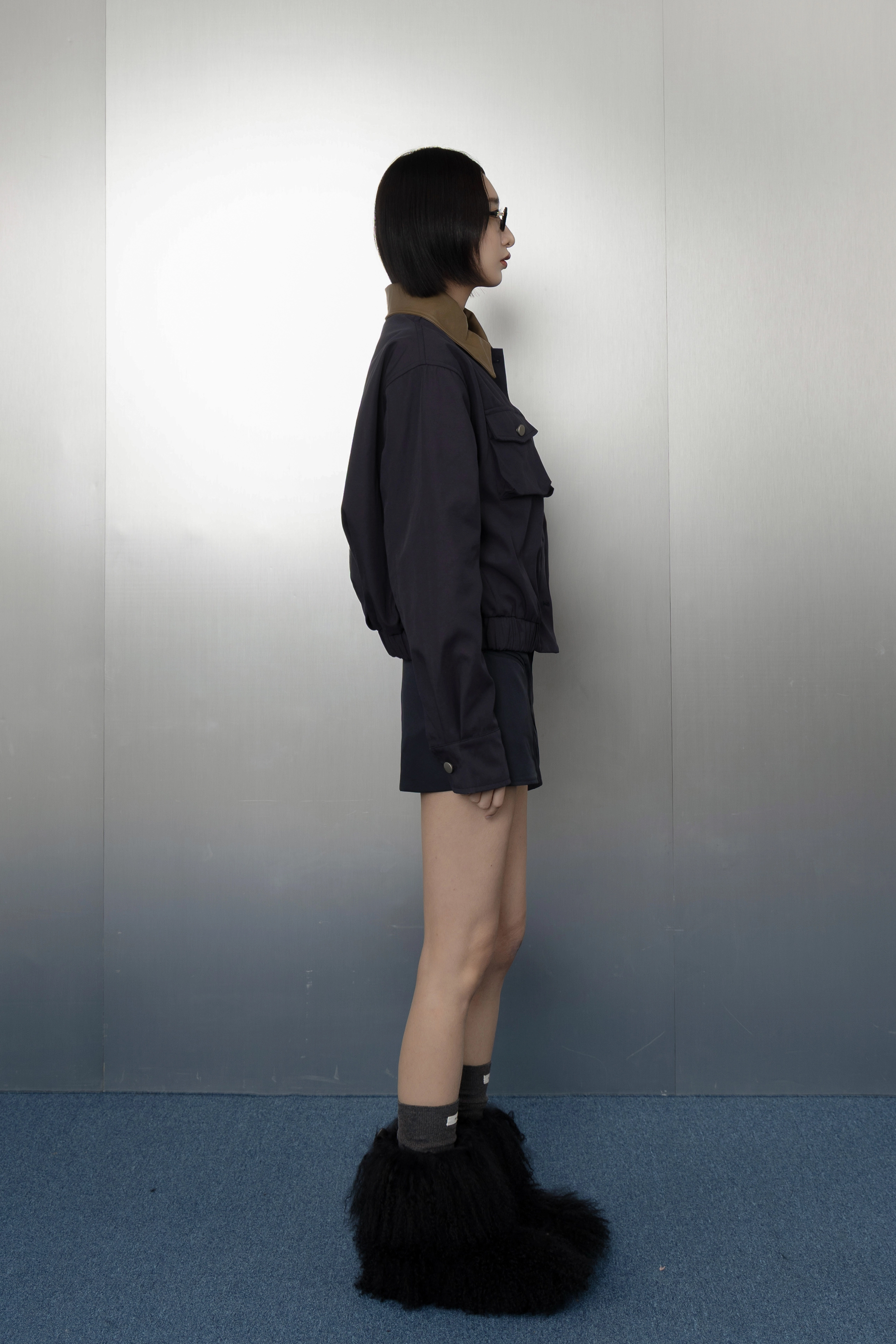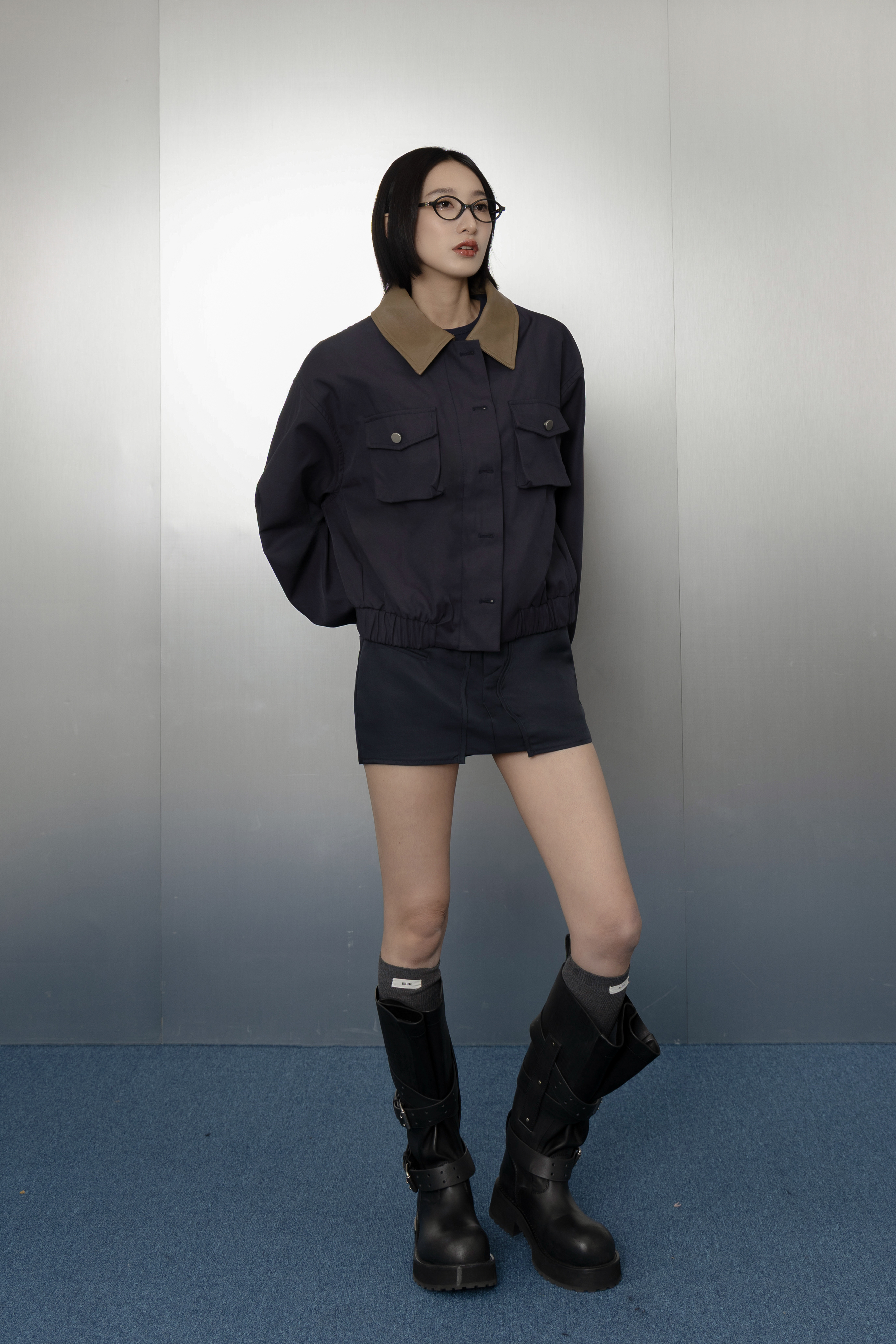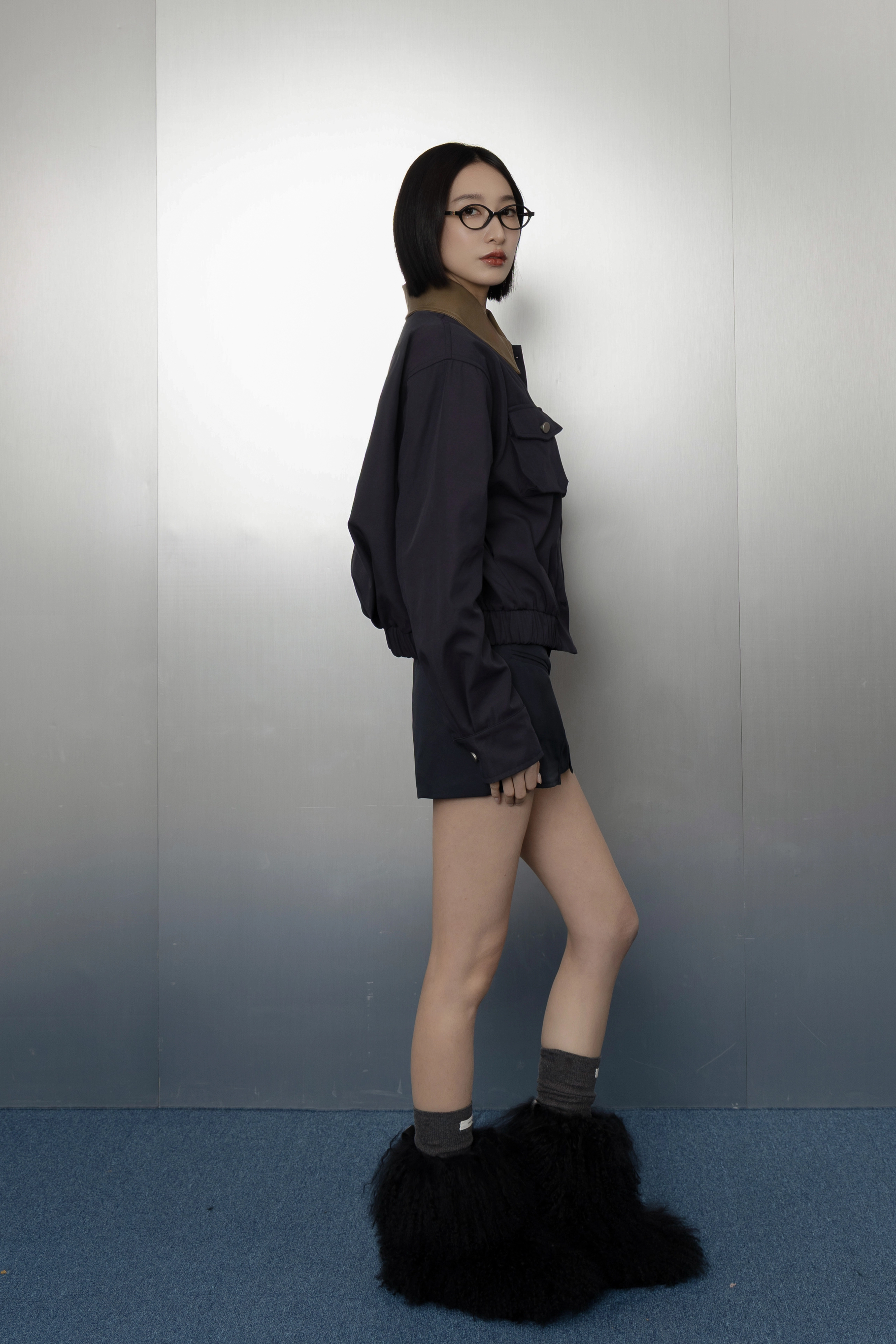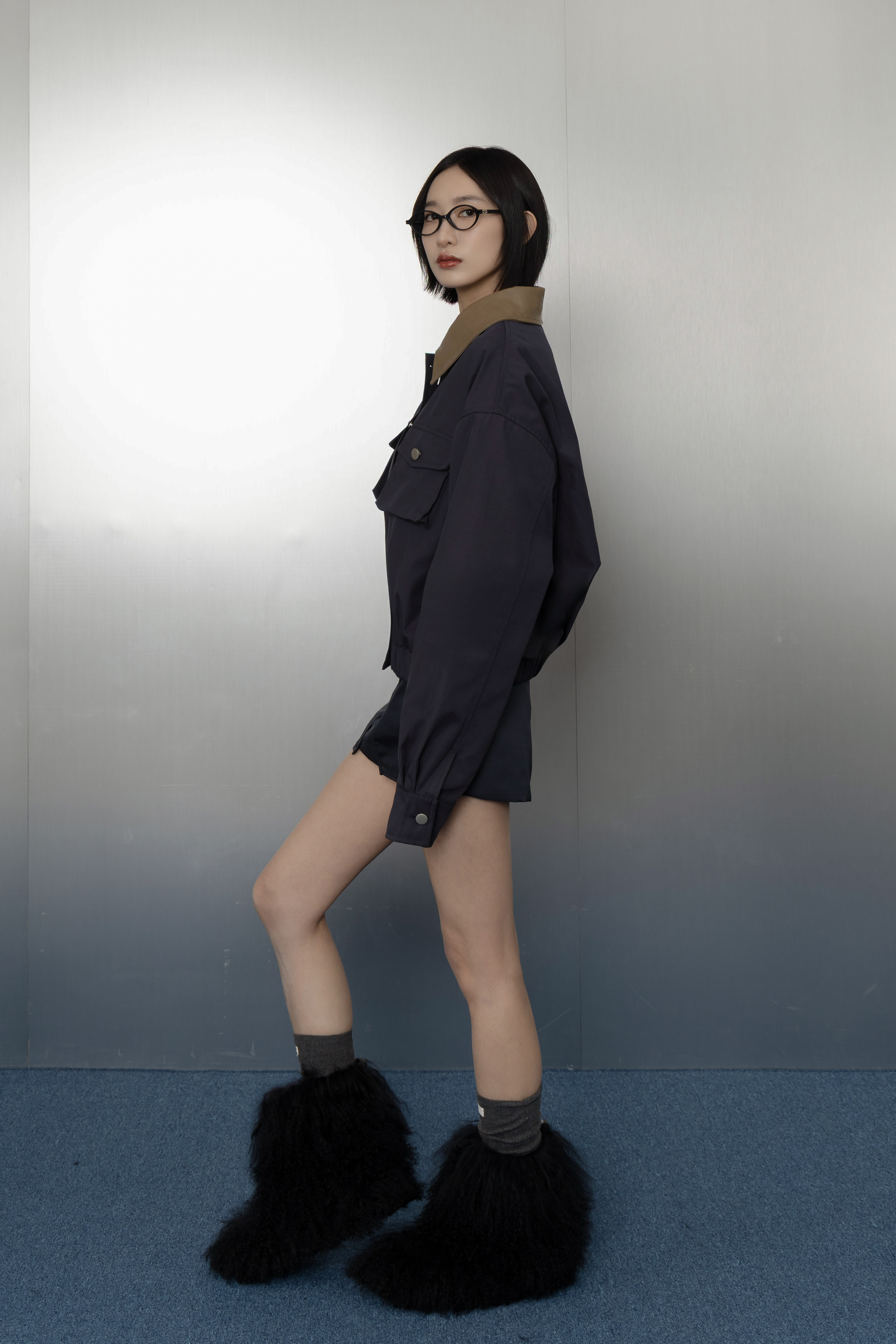 藍黑色的主調與溫潤的棕色領子碰撞,俐落的廓形剪裁輕鬆打造亮眼街頭風格。
