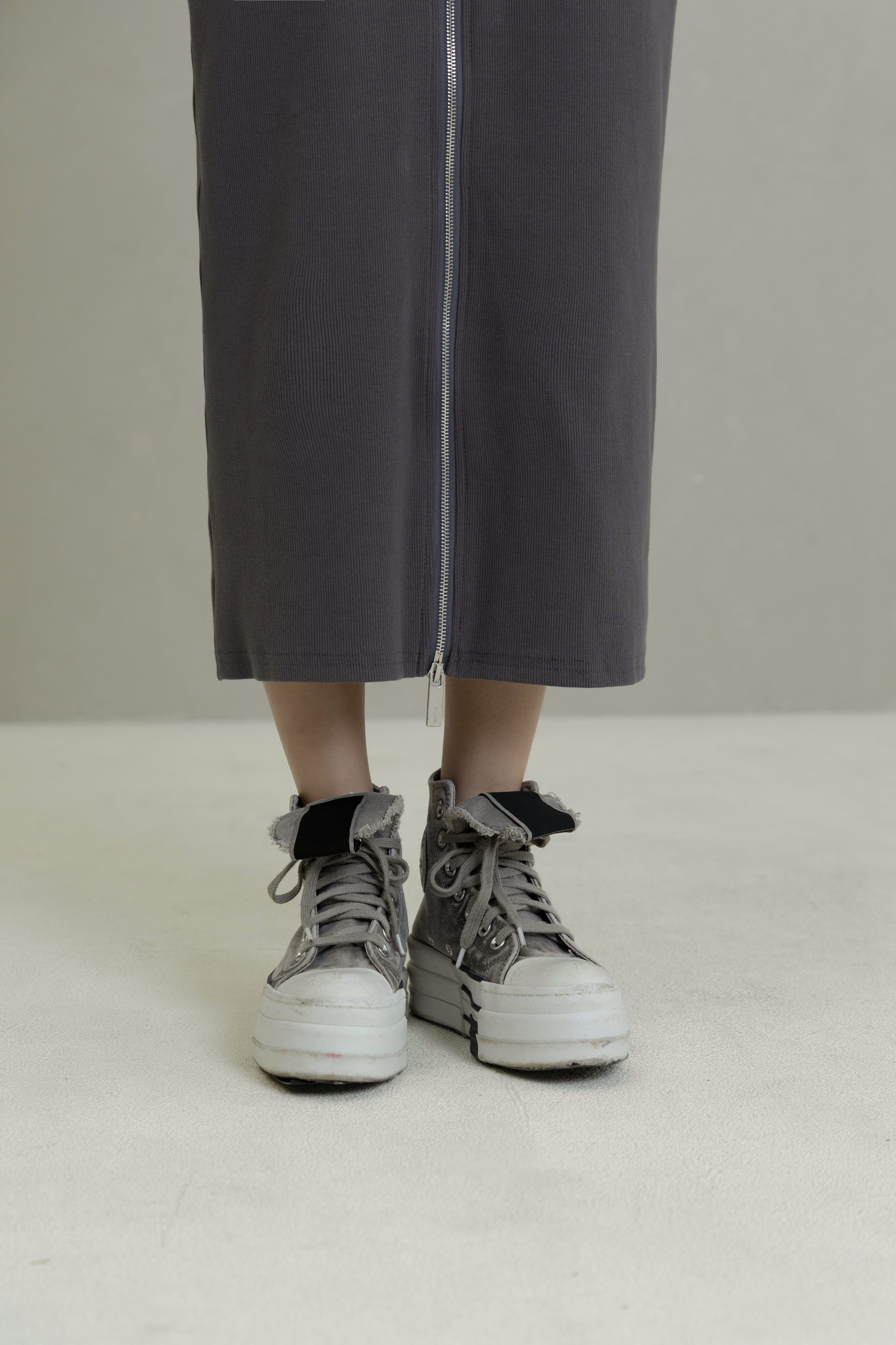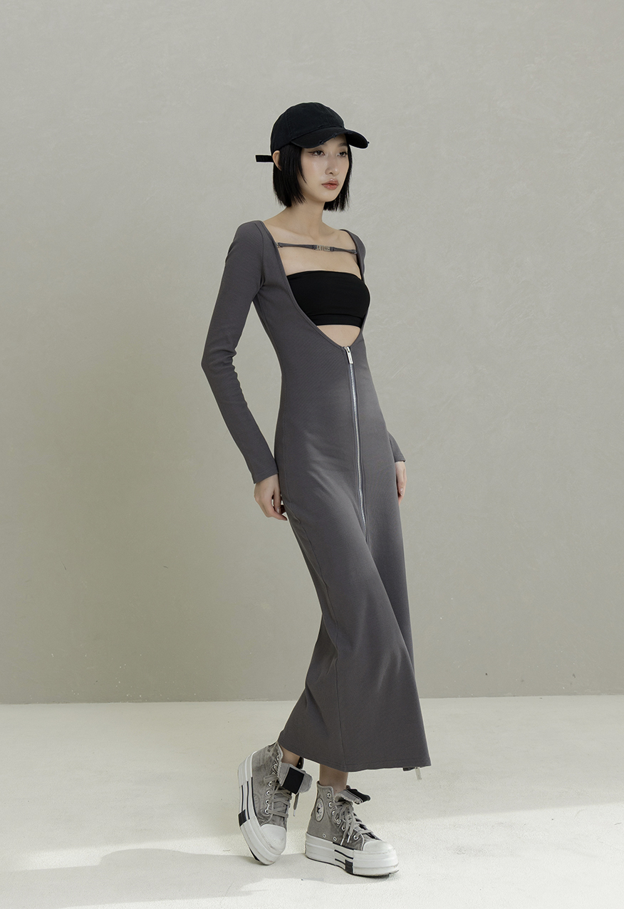 AW1082-迷霧灰V領拉鍊外罩長洋