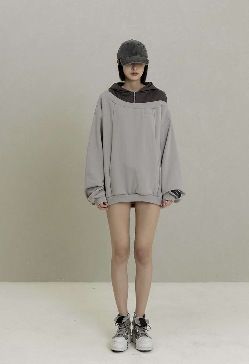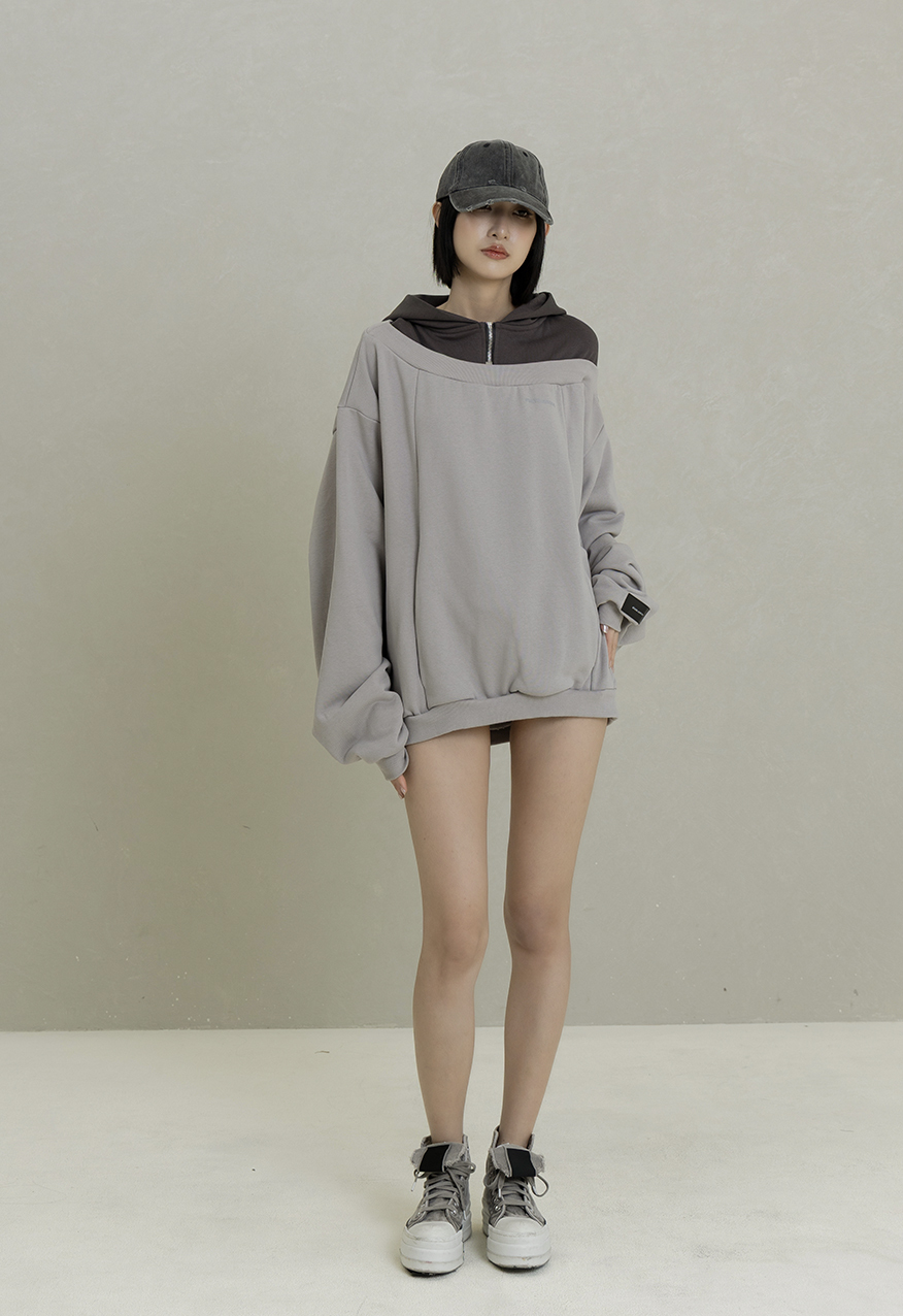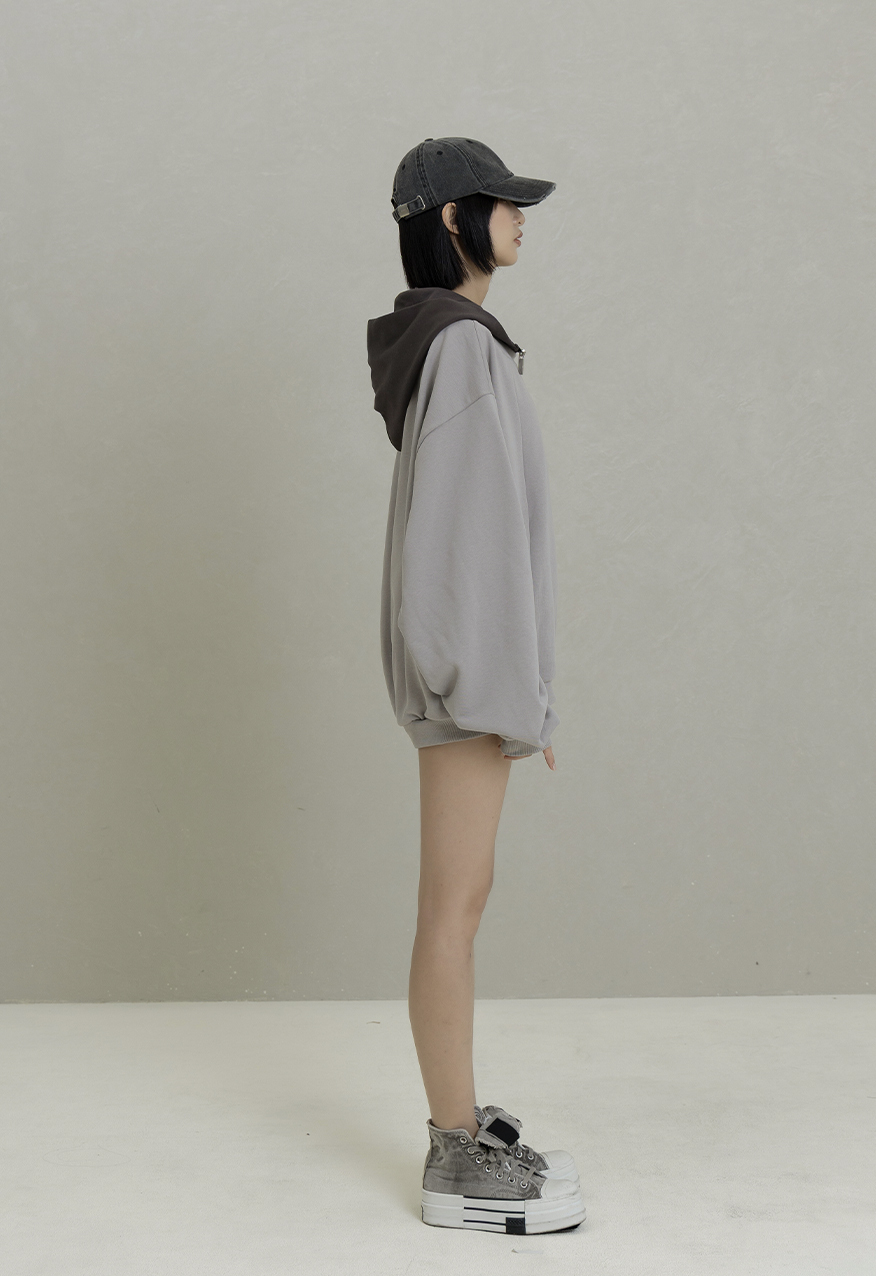 AW1084-水泥灰落肩拼接拉鍊連帽衛衣