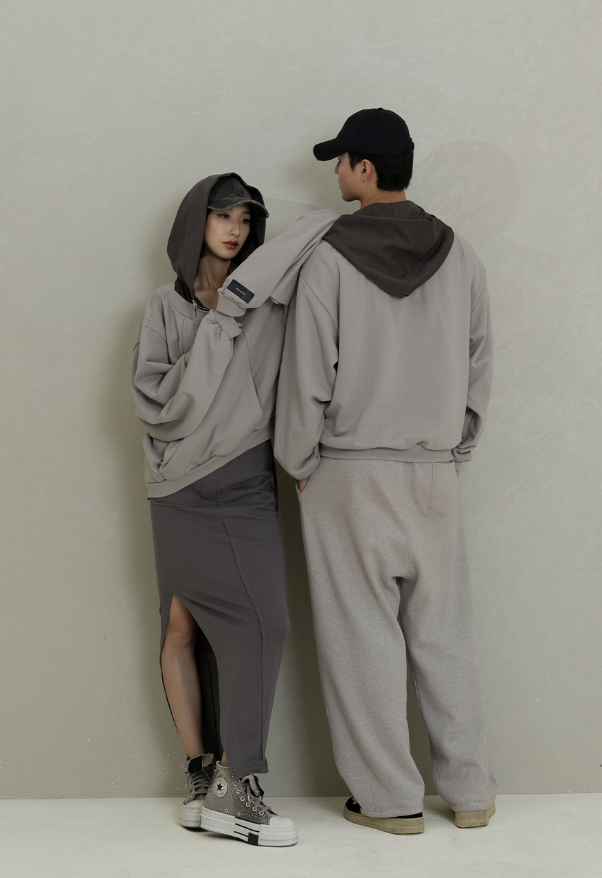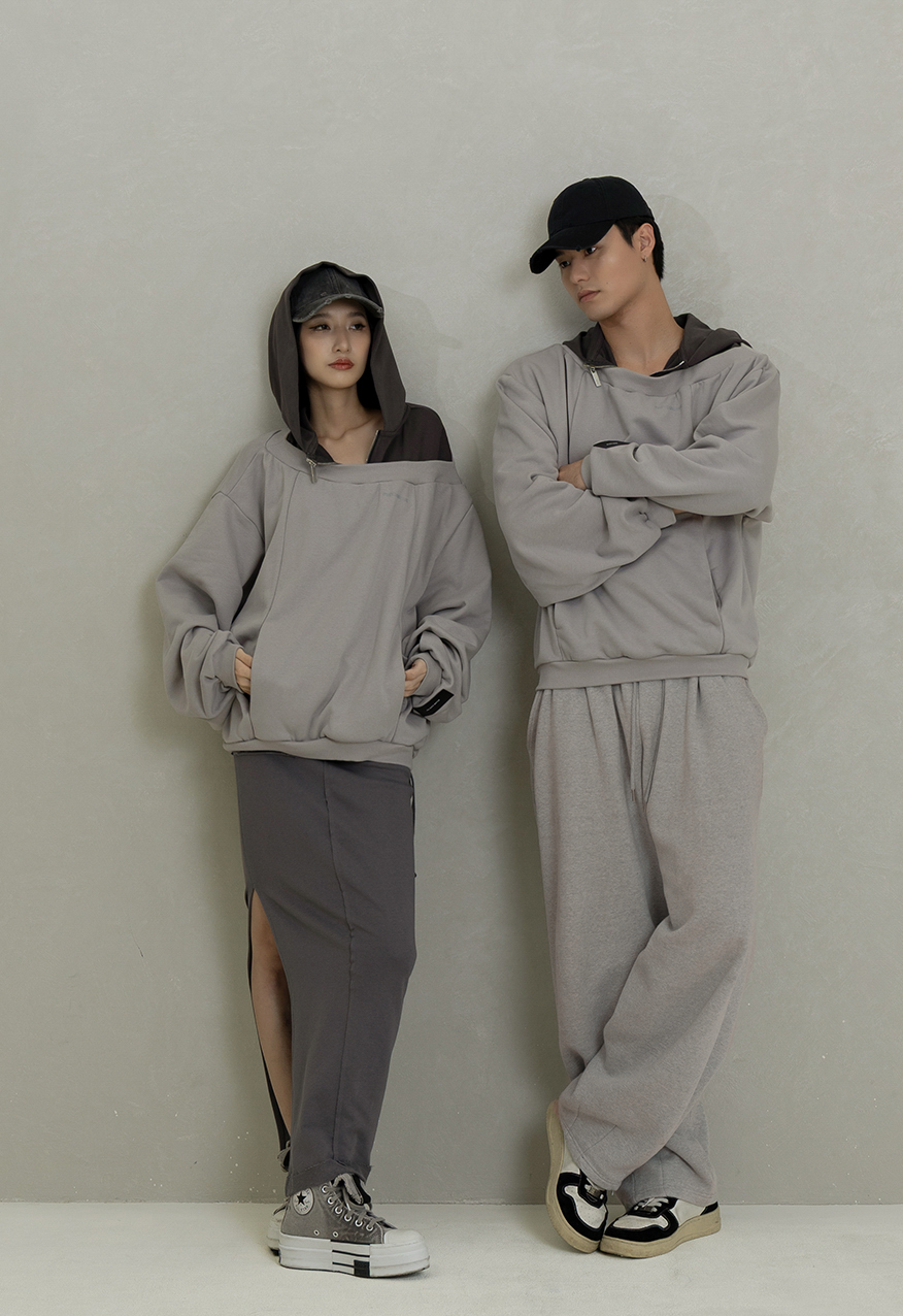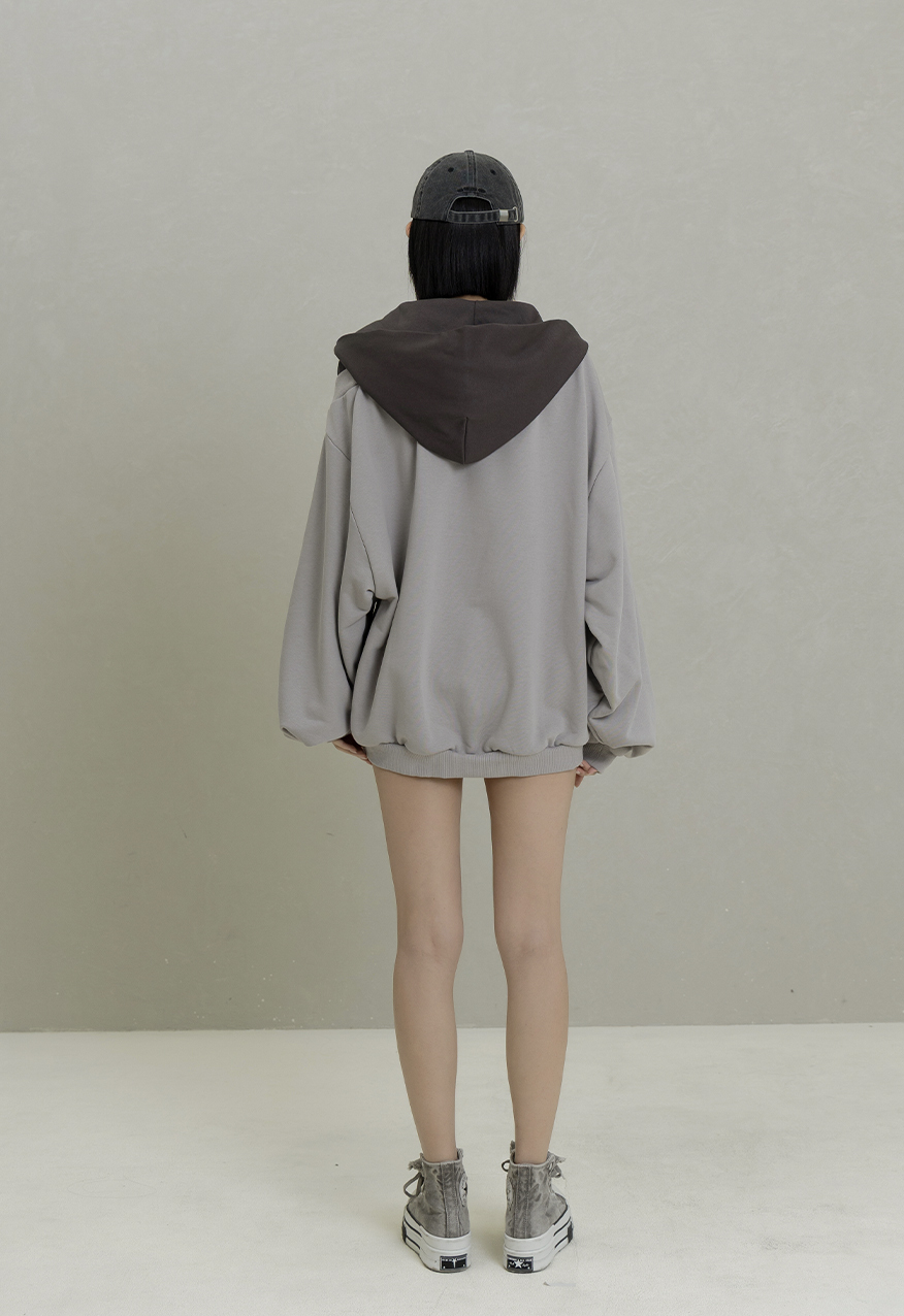 AW1084-水泥灰落肩拼接拉鍊連帽衛衣