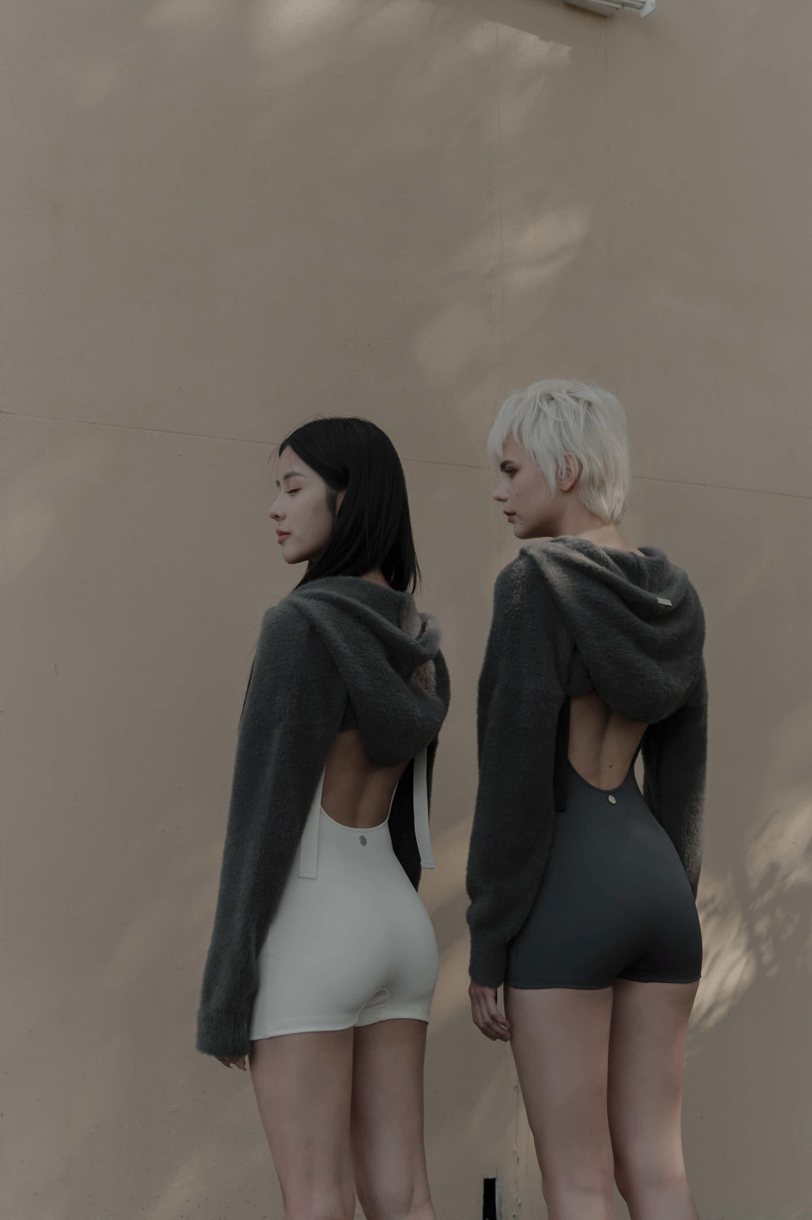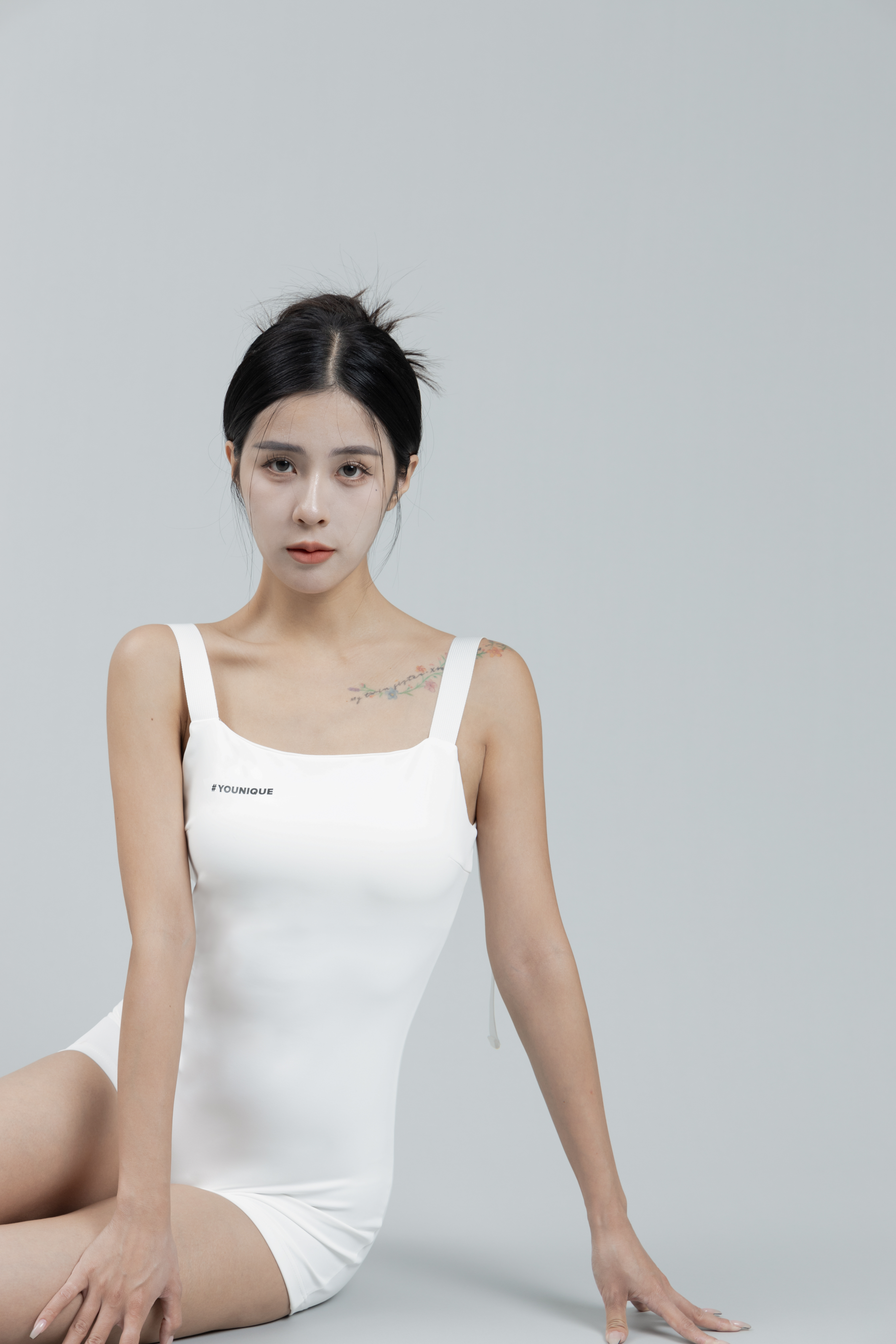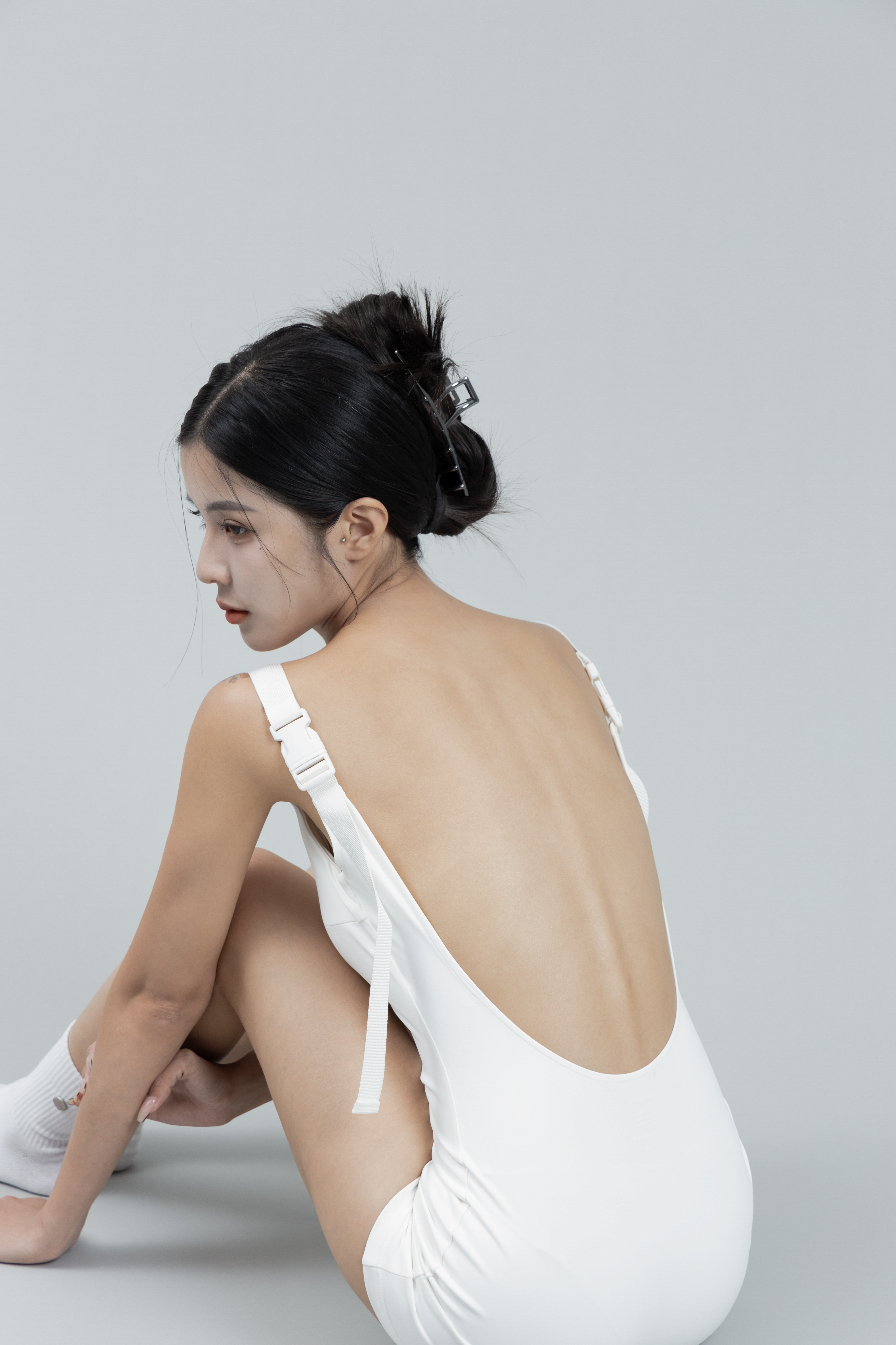 以類似泳衣的材質製成的黑色連身極短褲