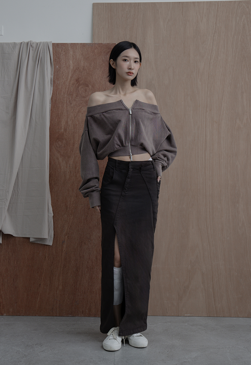 落肩剪裁、可調式拉鍊領口、微露鎖骨設計、短版修身比例、慵懶時髦