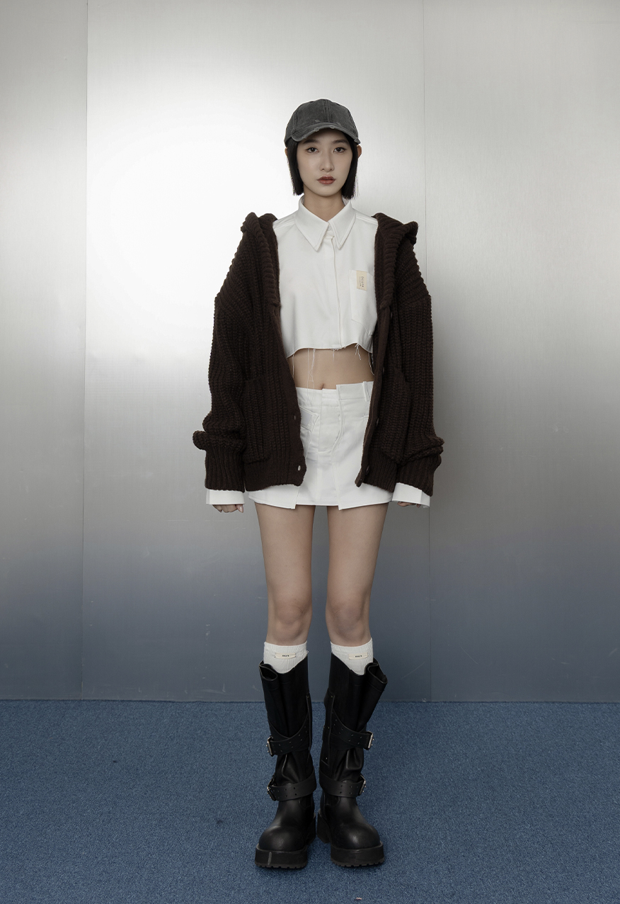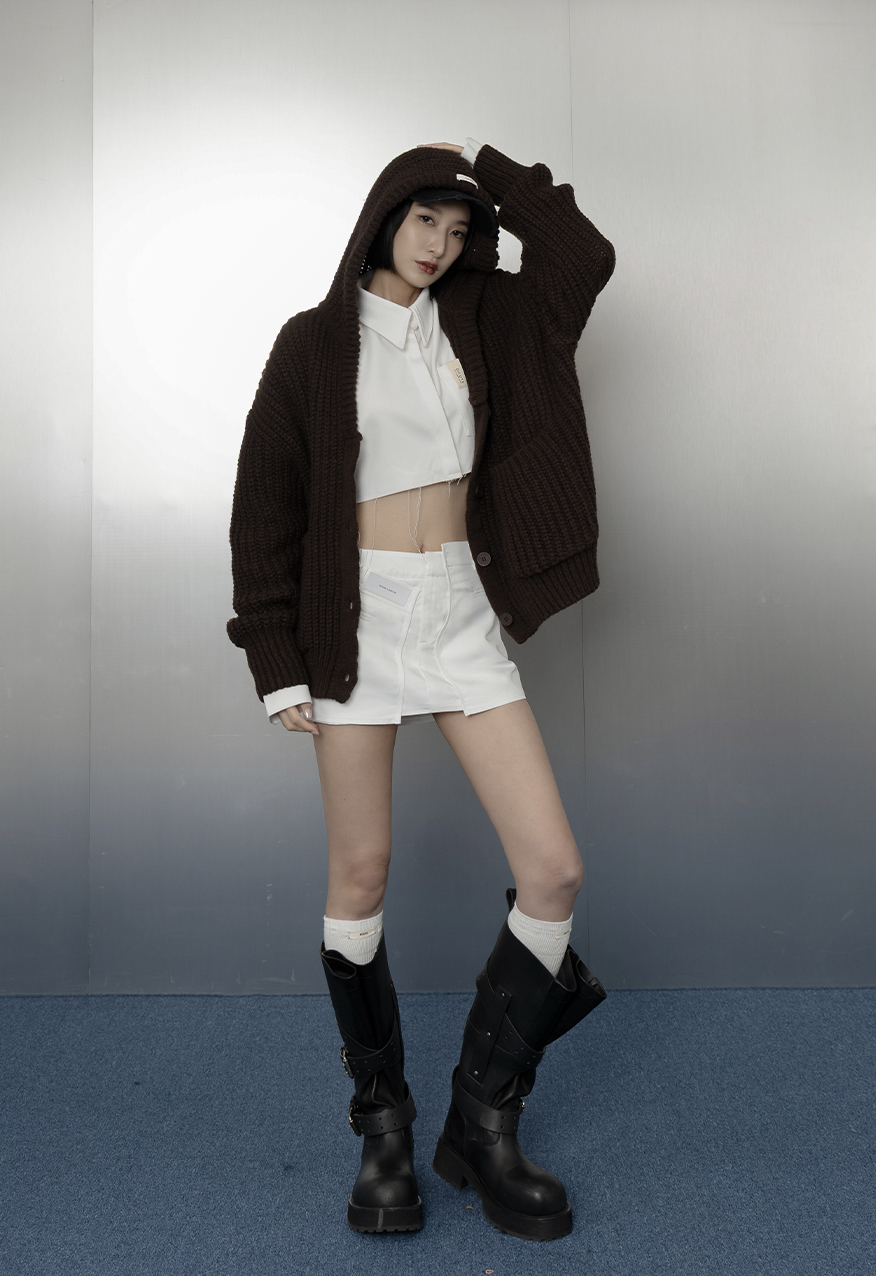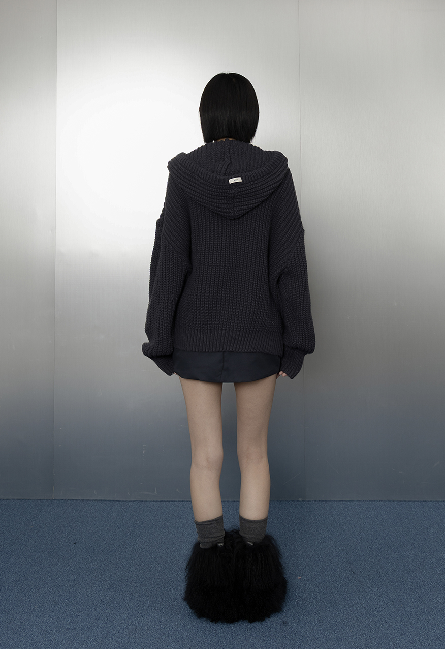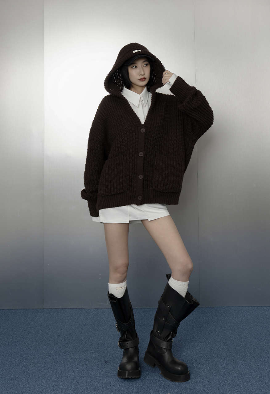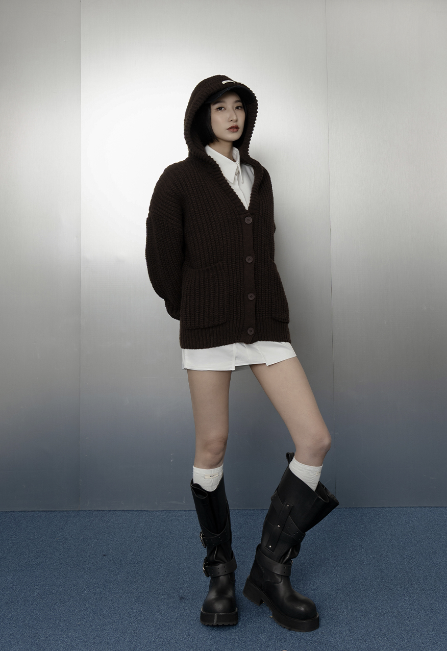 SS1112-烤焦糖中性廓形厚針織連帽外套